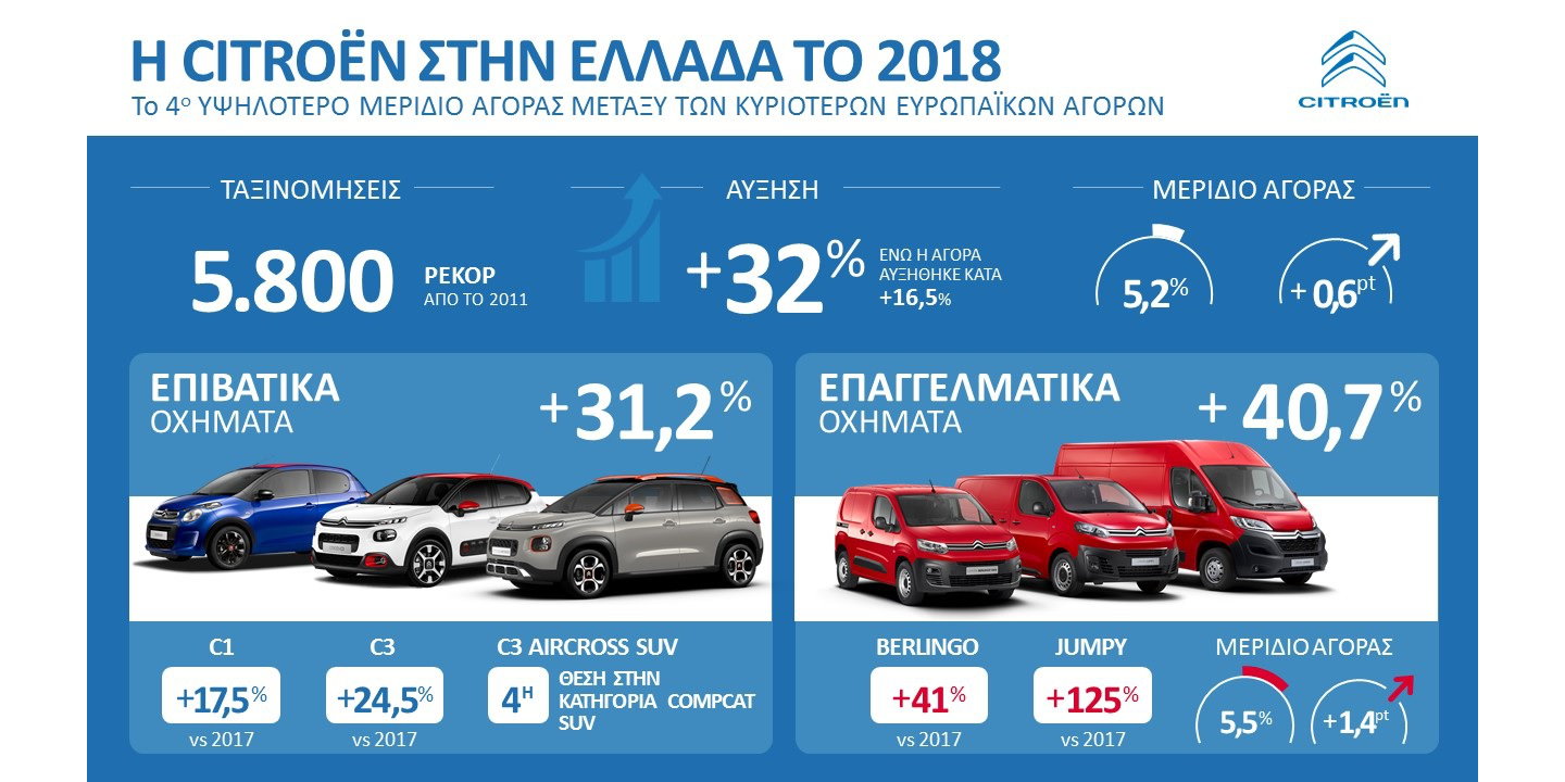 Σημαντικές επιτυχίες σημείωσε και στον τομέα των επαγγελματικών οχημάτων η Citroen, καθώς το 2018 σημειώθηκε αύξηση πωλήσεων +40,7% και το μερίδιο αγοράς ανήλθε στο 5,5%! Τεράστια ποσοστιαία αύξηση πωλήσεων σημείωσαν το C3 Enterprise (+58%), το Jumpy (+125%) και το Berlingo (+41%).