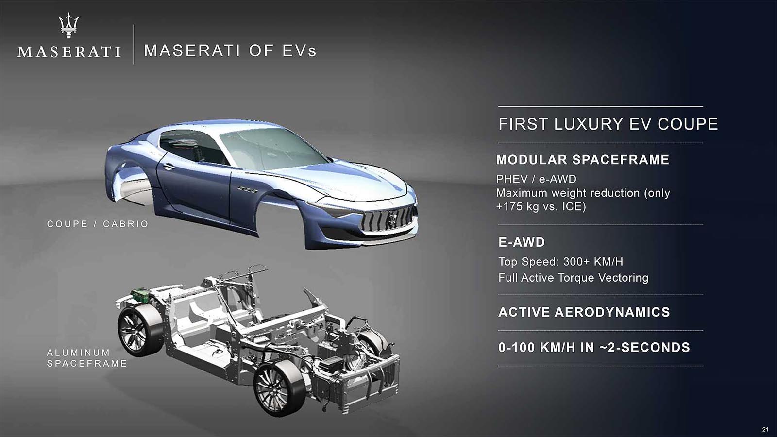 Η PHEV έκδοση θα συνδυάζεται με έναν V6 turbo βενζινοκινητήρα και η ηλεκτρική Alfieri θα έχει τρεις ηλεκτροκινητήρες (προφανώς δύο στον πίσω άξονα), θα είναι τετρακίνητη με ανεξάρτητη κατανομή ροπής στους τροχούς (torque vectoring) και η μπαταρία θα είναι στα 800V. Η Maserati ανακοινώνει ένα εκτιμώμενο 0-100 σε λιγότερο από 2 δευτερόλεπτα με τελική στα 300 χλμ./ώρα.
