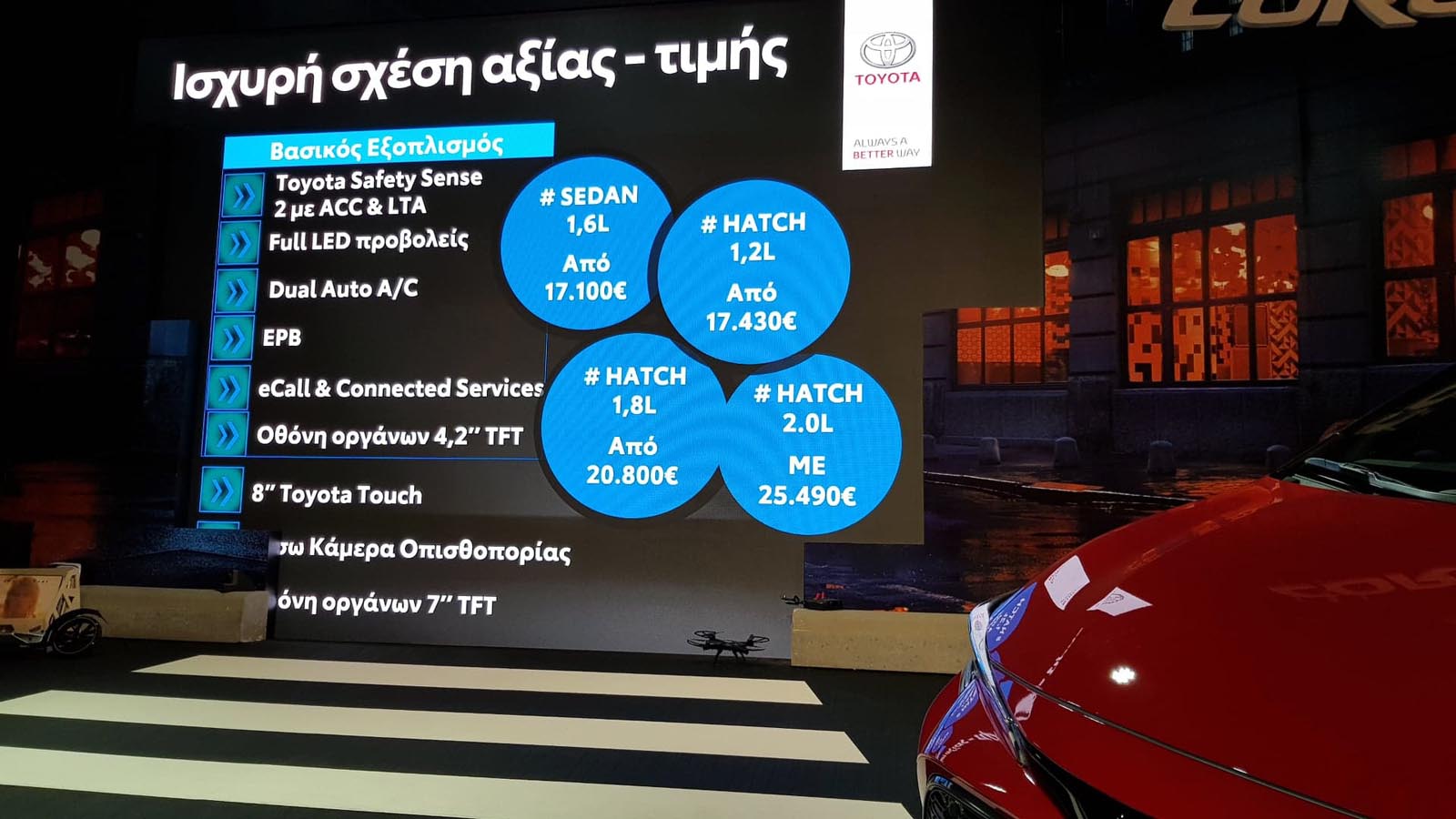 Συγκεκριμένα, η Corolla Sedan προσφέρεται στην ατμοσφαιρική έκδοση 1.6 με 132 ίππους και τιμή από 17.100€. Η Corolla Hatch ξεκινά με την turbo τετρακύλινδρη έκδοση των 1.200 κ.εκ. με 116 ίππους και τιμάται από τις 17.430€.