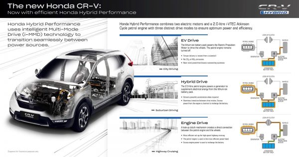 Το νέο Honda CR-V διατίθεται με προηγμένη υβριδική τεχνολογία κινητήρα. Το υβριδικό σύστημα χρησιμοποιεί ευφυή τεχνολογία Multi Mode Drive technology (i-MMD) συνδυάζοντας 2 ηλεκτροκινητήρες, έναν βενζινοκινητήρα κύκλου Atkinson, μπαταρία ιόντων λιθίου και κιβώτιο μιας σχέσης για υψηλά επίπεδα αθόρυβης λειτουργίας, απόκρισης και απόδοσης. Διατίθεται σε εκδόσεις FWD και AWD.