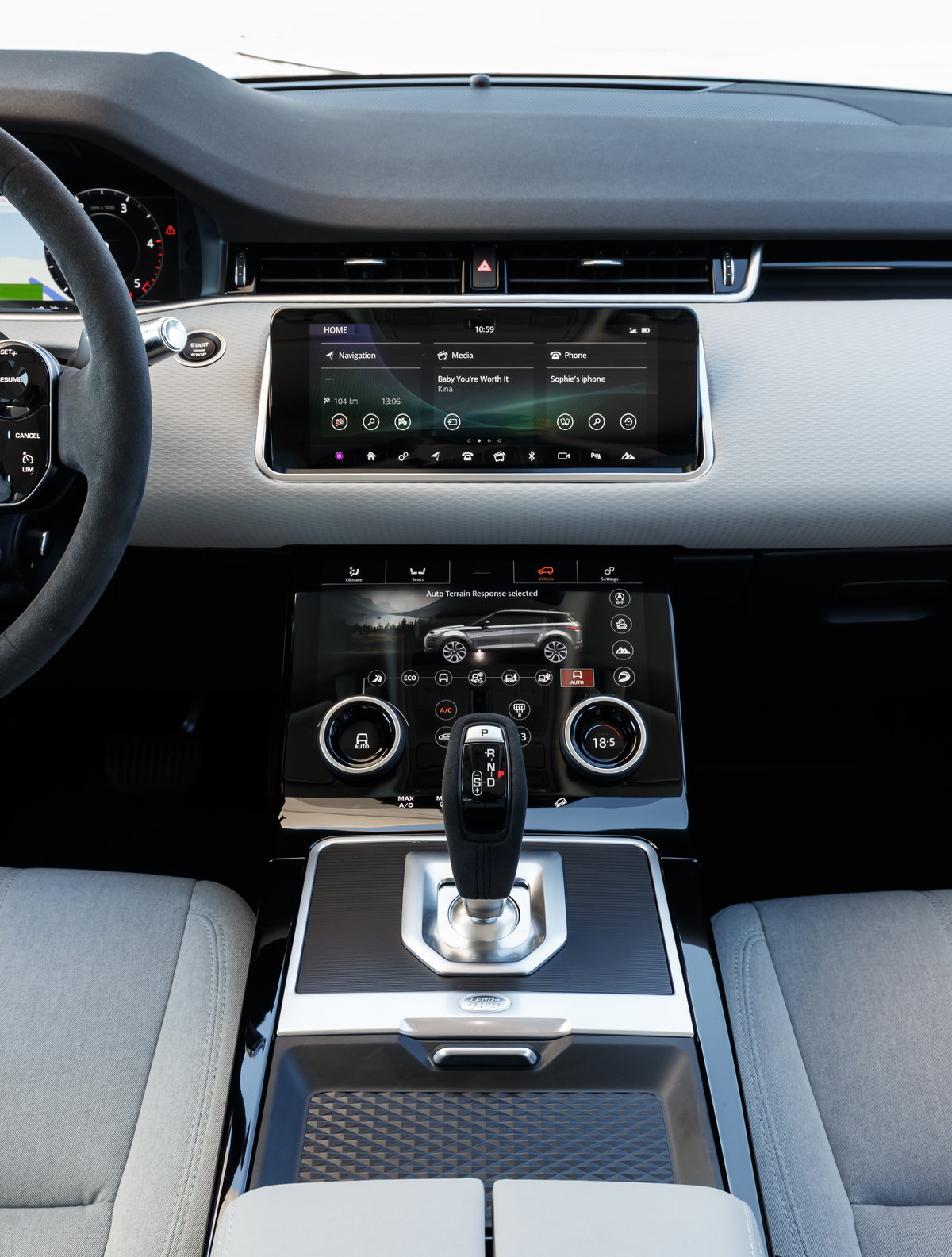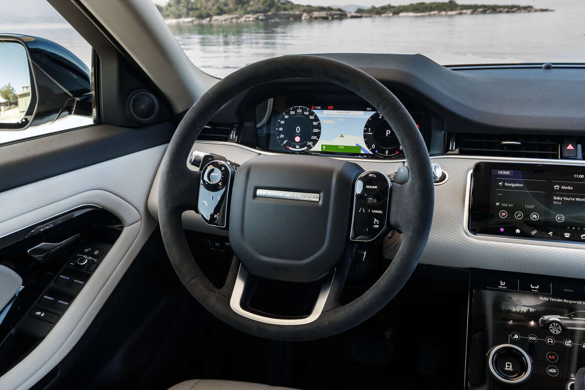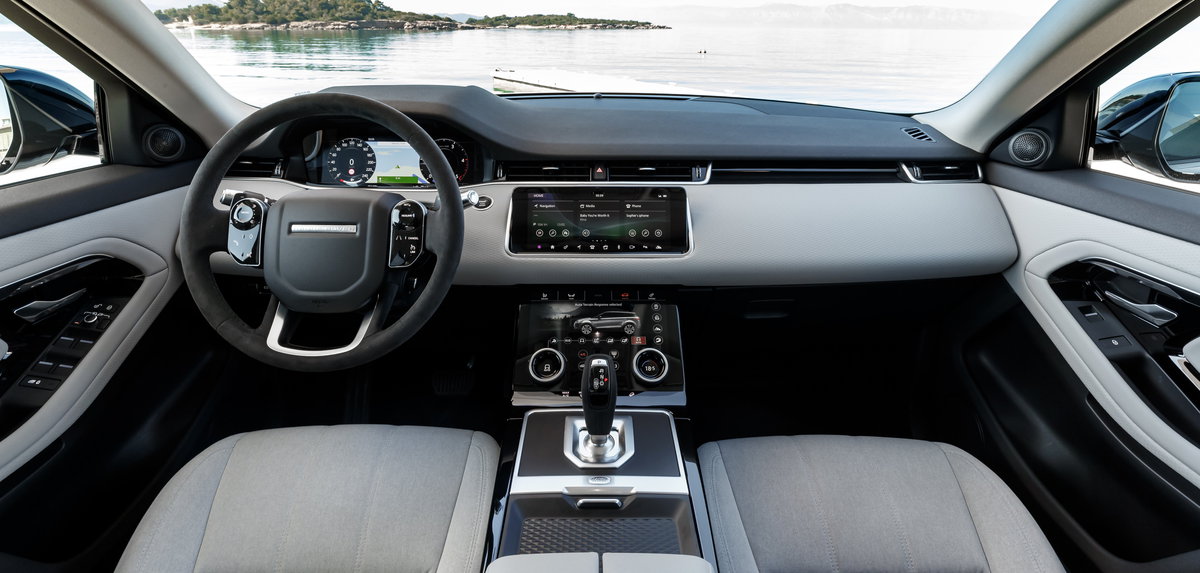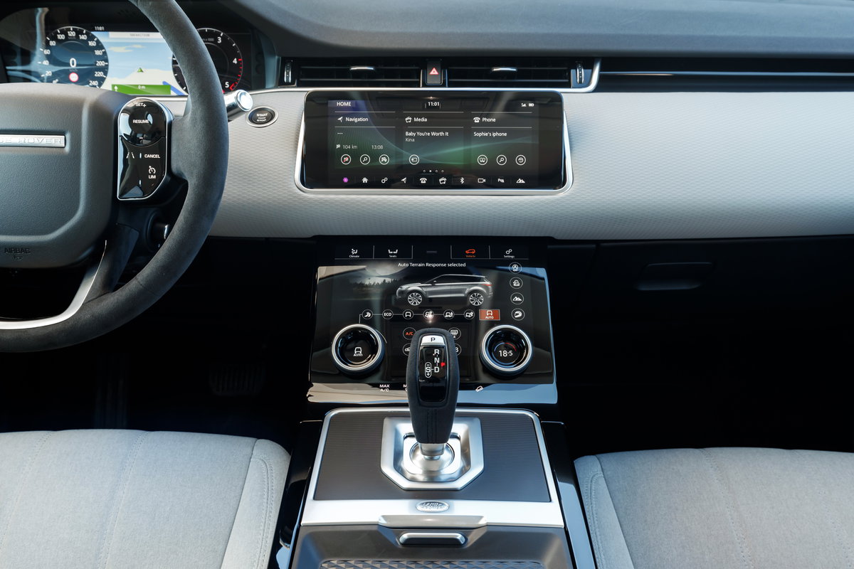 Από την πάνω οθόνη με την ασυνήθιστη για αυτοκίνητα αλλά συνηθισμένη για high end smartphones αναλογία 19:9 ελέγχονται οι λειτουργίες του συστήματος Touch Pro Duo που δεν περιλαμβάνουν μόνο ότι έχει σχέση με το infotainment. Από την κάτω επιλέγονται τα προγράμματα οδήγησης. Στα τετρακίνητα Evoque, για πρώτη φορά χρησιμοποιείται στο μικρό Range το σύστημα Terrain Response 2, είναι συνολικά πέντε: τα Comfort, Sand, Grass- Gravel- Snow, Mud & Ruts που αντιστοιχούν σε ότι λέει το όνομά τους και το Auto. Με αυτό οι εκάστοτε ρυθμίσεις προκύπτουν με βάση της ισχύουσες συνθήκες. Όσο για την κατανομή της ροπής στους δύο άξονες είναι συνεχής με δυνατότητες torque vectoring αλλά και αποσύμπλεξης του πίσω άξονα, για λόγους οικονομίας, όταν η διαθέσιμη ροπή περνά χωρίς πρόβλημα στο δρόμο μόνο από τους εμπρός τροχούς.