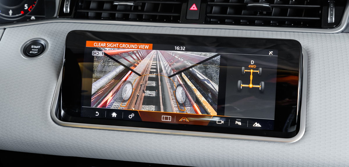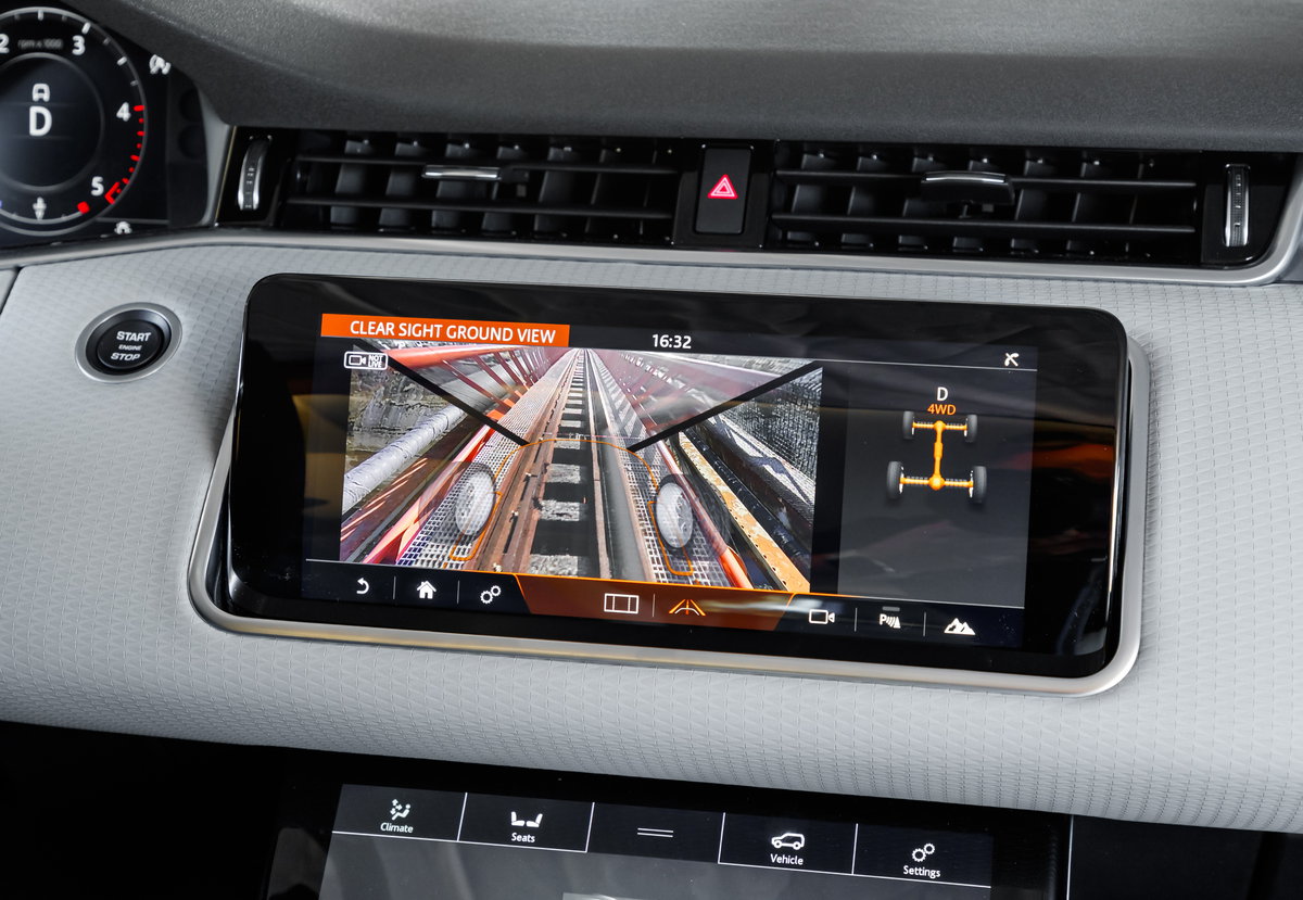 Στις περιπτώσεις που οδηγός δεν είναι απόλυτα βέβαιος για τη διαμόρφωση του εδάφους δεν χρειάζεται να κατέβει, καθώς μπορεί να χρησιμοποιήσει το ClearSight Ground View. Πρόκειται για την εξέλιξη του «διάφανου καπό» που είχε παρουσιαστεί πριν 4 περίπου χρόνια από τη Land Rover και έτσι στην κεντρική οθόνη του Evoque προβάλλεται η εικόνα του εδάφους πάνω από το οποίο περνά -για το σκοπό αυτό υπάρχουν κάμερες στο κάτω μέρος του- προκειμένου ο οδηγός να μπορεί να αποφύγει τις κακοτοπιές. Ή απλά να βλέπει τι γίνεται από κάτω του όταν περνά την σιδηροδρομική γέφυρα του Ισθμού της Κορίνθου, όπως εμείς.