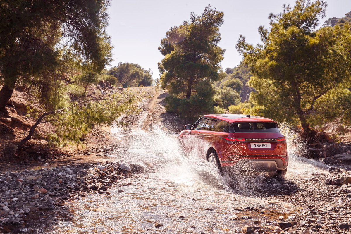 Εκεί όμως που το Evoque εντυπωσιάζει είναι πέρα από την άσφαλτο, καθώς ο οδηγός πέρα από την πολύ καλή τετρακίνηση, τα προγράμματα οδήγησης και την τεχνολογία έχει στην διάθεσή του μια απόσταση 212 χιλιοστών από το έδαφος, γωνίες προσέγγισης και διαφυγής 25 και 30,6 μοιρών αντίστοιχα, αλλά και τη δυνατότητα διέλευσης μέσα από νερό βάθους 600 χιλιοστών. Έτσι στην ορεινή Κορινθία που το οδηγήσαμε, στα πλαίσια της παγκόσμιας παρουσίασής του που γίνεται στη χώρα μας, περνούσε χωρίς πρόβλημα μέσα από ρυάκια, κατέβαινε χάρη και στο hill descend από απότομες κατηφόρες και μπορούσε να κινηθεί με αρκετά μεγάλη για τις συνθήκες ταχύτητα τόσο στο χώμα όσο και σε δρόμο με γαρμπίλι.