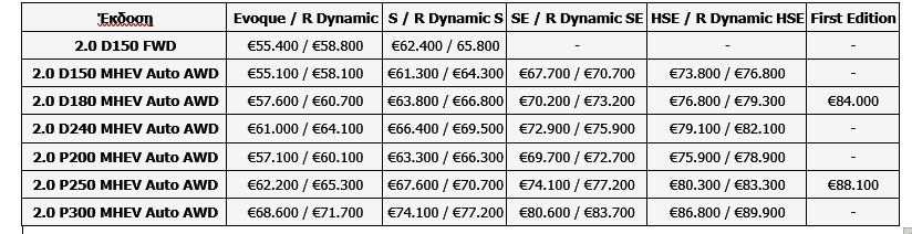 Οι τιμές του νέου Range Rover Evoque ξεκινούν από τις 55.100 ευρώ, που αντιστοιχούν στην έκδοση D150 -diesel 2.000 κυβικών με 150 ίππους, MHEV, τετρακίνηση, αυτόματο κιβώτιο και το βασικό επίπεδο εξοπλισμό. Πάνω από αυτό υπάρχουν και τα πιο πλούσια S, SE και HSE. Στον αναλυτικό τιμοκατάλογο του μοντέλου, που μπορείτε να τον δείτε παρακάτω, υπάρχει και η προσθιοκίνητη D150 με χειροκίνητο κιβώτιο και χωρίς MHEV, που με 55.400 ευρώ δεν έχει κανένα απολύτως νόημα.