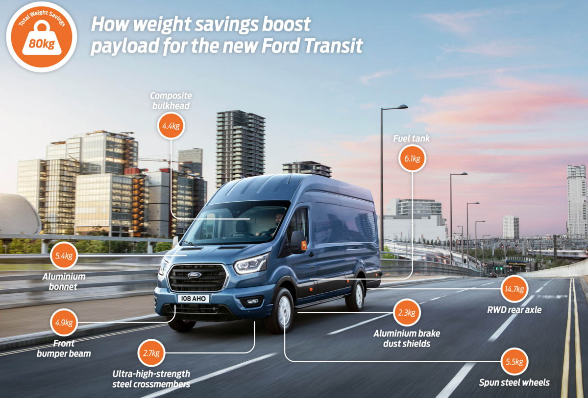 Οι παραπάνω είναι μερικές μόνο από τις καινοτομίες που βοήθησαν τους μηχανικούς της Ford να μειώσουν το απόβαρο του νέου Transit, ώστε να μπορούν οι πελάτες να μεταφέρουν μεγαλύτερα φορτία. Το νέο, πισωκίνητο Transit 350 GVM με το μακρύ μεταξόνιο και τη μεσαίου μεγέθους οροφή είναι, για παράδειγμα, κατά 80 κιλά ελαφρύτερο από το εφάμιλλο σε προδιαγραφές απερχόμενο μοντέλο. Το αντίστοιχο προσθιοκίνητο van είναι κατά 48 κιλά ελαφρύτερο.