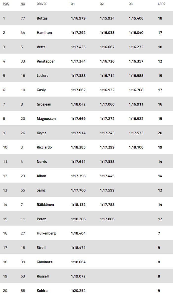 Ο Bottas συνεχίζει την εξαιρετική του φετινή πορεία, δεύτερος ταχύτερος ήταν ο Hamilton, ακολούθησαν οι Ferrari των Vettel και Leclerc και ανάμεσα τους η Red Bull του Verstappen.