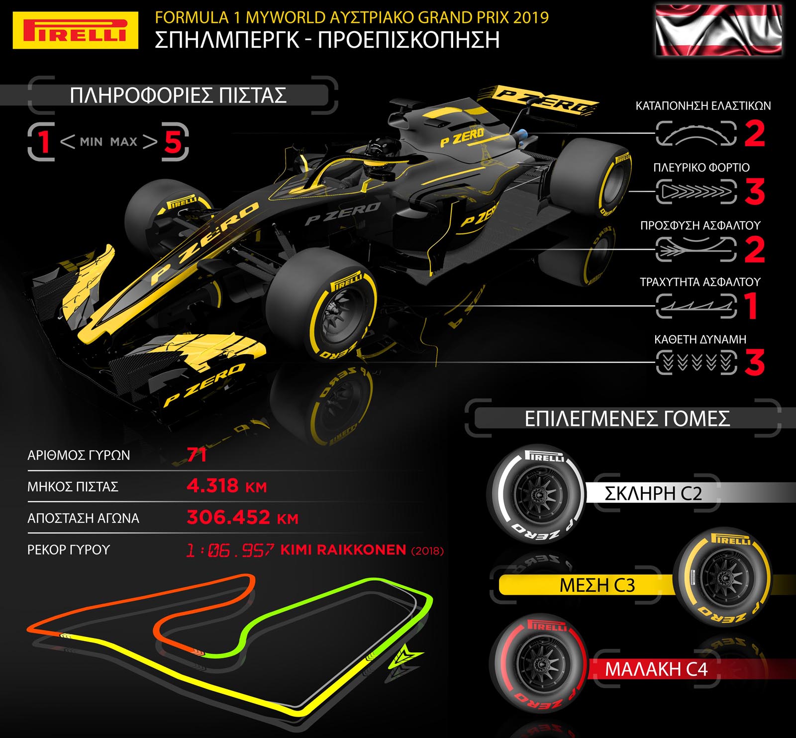 Το περσινό ρεκόρ των κατατακτήριων δοκιμών που είναι συνάμα ο ταχύτερος γύρος όλων των εποχών, σ’ αυτή την πίστα ήταν 1m03.130s. Δε θα μας εκπλήξει αν δούμε να καταρρίπτεται ξανά αυτό το Σαββατοκύριακο. Η Pirelli φέρνει στην Αυστρία τη γόμα C2 ως άσπρο σκληρό ελαστικό, τη γόμα C3 ως κίτρινο μέσο ελαστικό και τη γόμα C4 ως κόκκινο μαλακό ελαστικό.