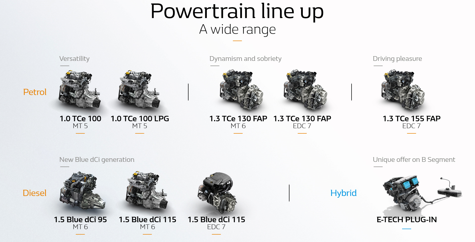 Στην παρακάτω εικόνα φαίνονται όλες οι εκδόσεις κινητήρων του νέου Captur που περιλαμβάνουν τον 1.000άρη TCe με 100 ίππους (και με υγραέριο LPG), τον 1.300άρη TCe με τους 130 ίππους και τον κορυφαίο με αυτόματο κιβώτιο EDC και 155 ίππους. Από πλευράς diesel συναντάμε τον 1.5 Blue dCi με 95, 115 ίππους και με το αυτόματο διπλόδισκο EDC-7.