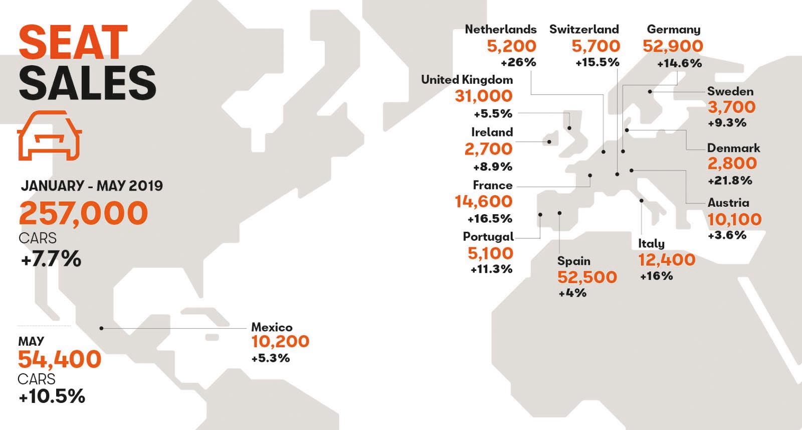 Η SEAT ολοκλήρωσε το πρώτο εξάμηνο του 2019 με τον υψηλότερο αριθμό πωλήσεών στην ιστορία της. Οι παγκόσμιες πωλήσεις της ισπανικής αυτοκινητοβιομηχανίας αυξήθηκαν κατά 8,4% και ανέρχονται συνολικά σε 314.300 αυτοκίνητα. Για πρώτη φορά, η SEAT πώλησε περισσότερα από 300.000 οχήματα το πρώτο εξάμηνο του έτους και ξεπέρασε το ρεκόρ της αντίστοιχης περιόδου του 2018 (289.900).