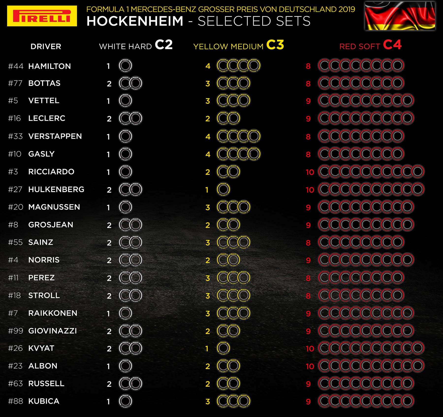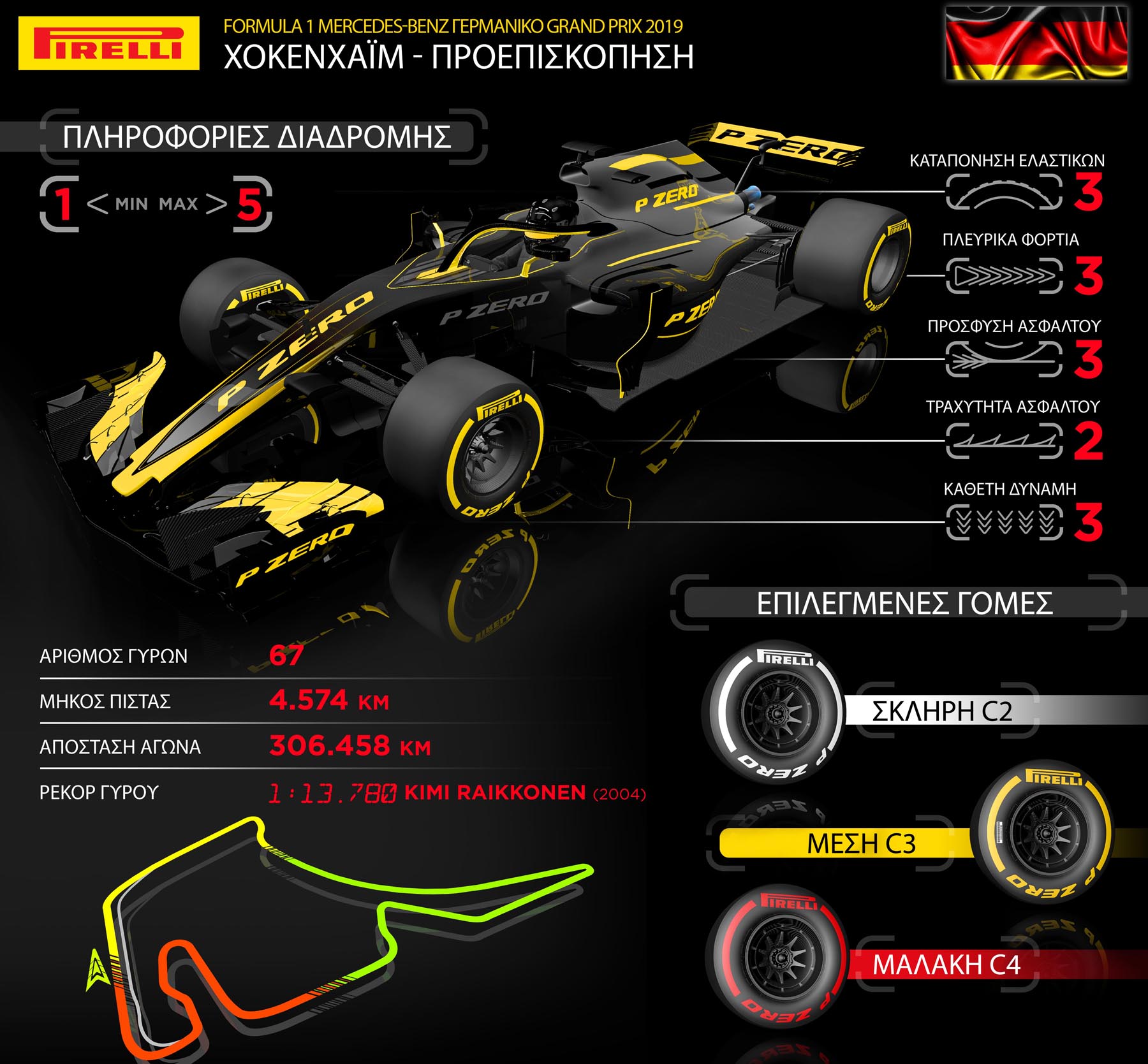 Η νέα κομμένη εκδοχή της πίστας μετά το 2002, είναι πολύ πιο ισορροπημένη διαθέτοντας λίγο απ’ όλα. Ως αποτέλεσμα επιλέχθηκαν γόμες από το μέσο της γκάμας P Zero γι’ αυτό το Σαββατοκύριακο: Η C2 ως σκληρή, η C3 ως μέση και η C4 ως μαλακή. Αυτή η επιλογή είναι παρεμφερή με την περσινή επιλογή μέσης, μαλακής και πάρα πολύ μαλακής γόμας.