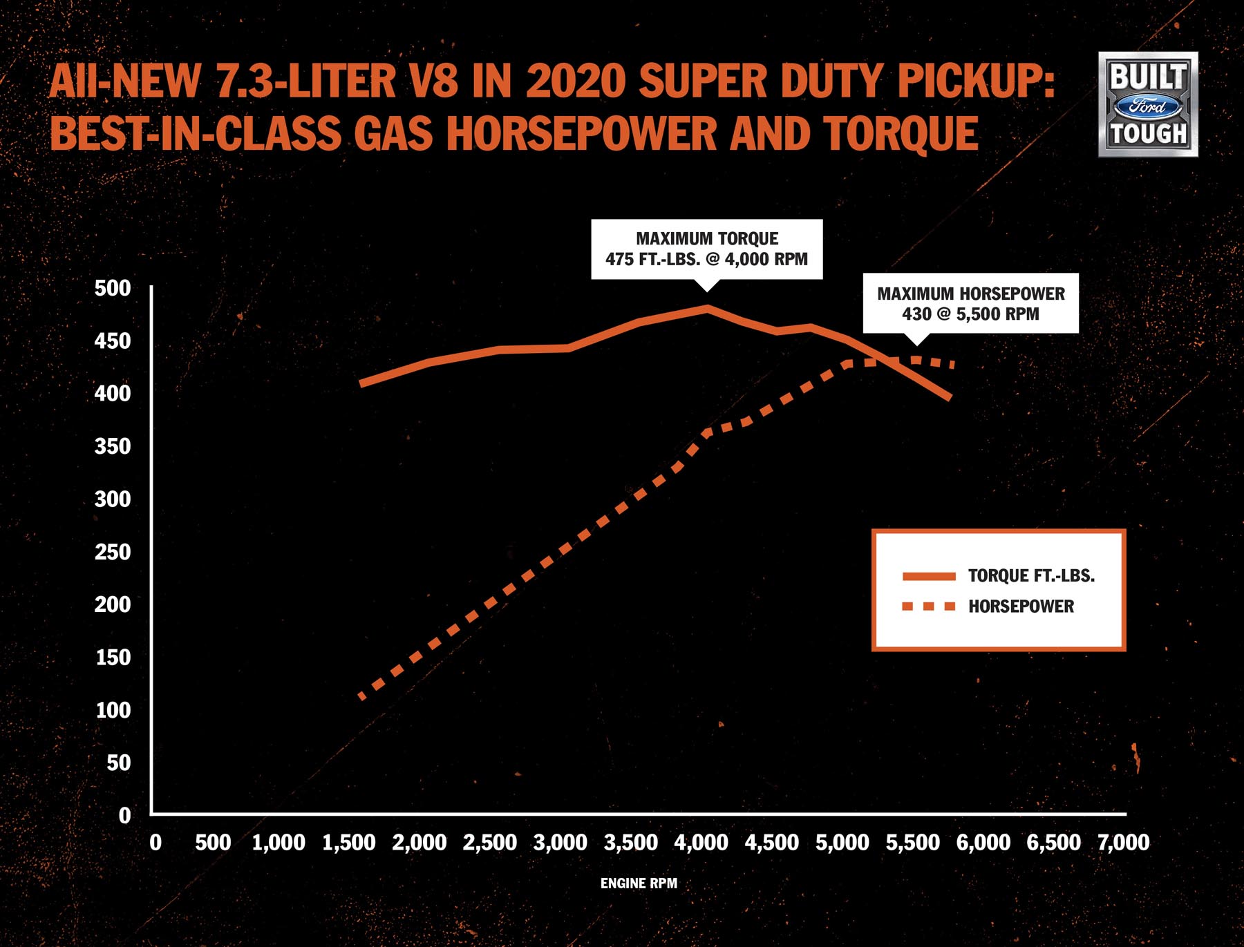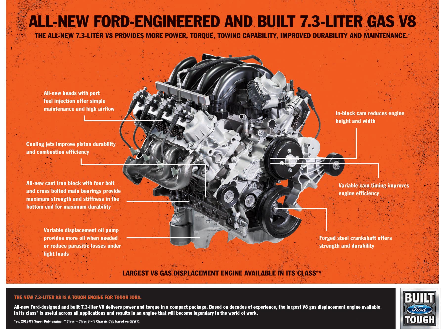 Σύμφωνα με την Ford το νέο μοτέρ έχει κατασκευαστεί για heavy duty καθήκοντα προσφέροντας αστείρευτη ροπή από τις χαμηλές στροφές και υψηλή αξιοπιστία. Ο νέος V8 7.3 αποδίδει 436 άλογα στις 5.500 σ.α.λ. και 644 Nm στις 4.000 σ.α.λ.