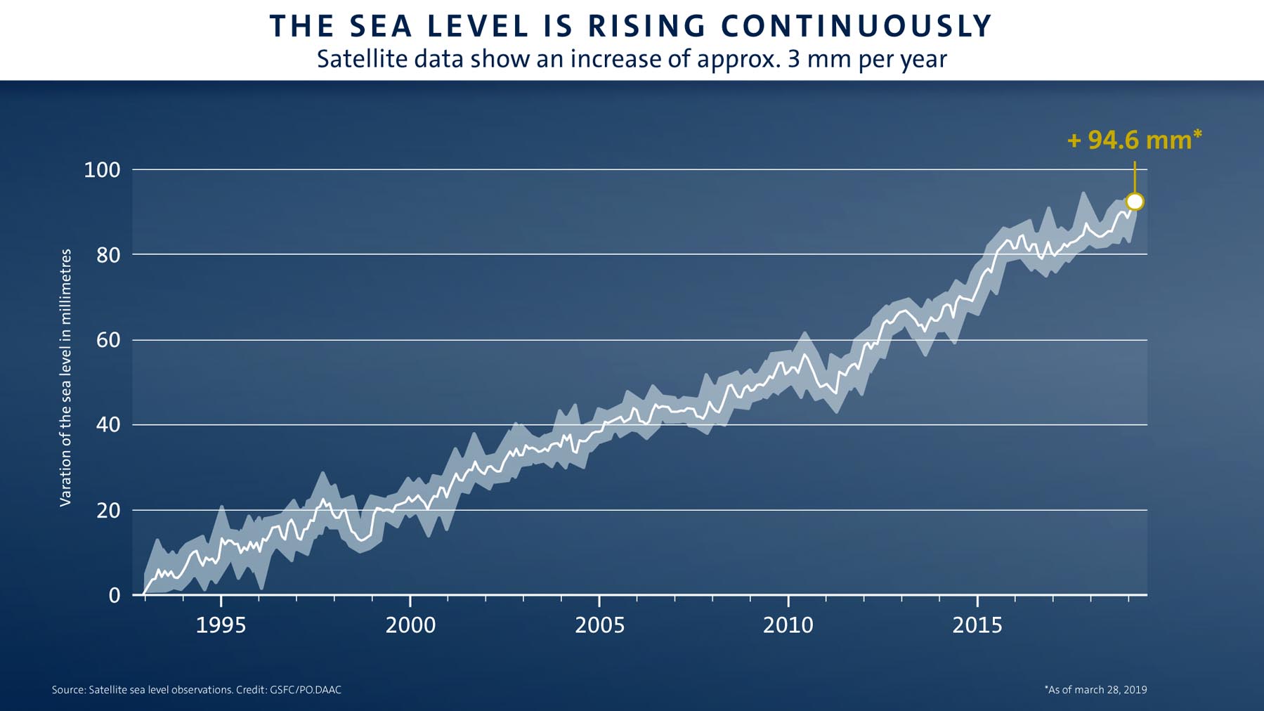 - Κίνδυνος για τις ακτές και τα νησιά: τα επίπεδα της θάλασσας έχουν αυξηθεί κατά σχεδόν 10 εκατοστά τα τελευταία 20 χρόνια. Κάτι που επιταχύνεται συνεχώς: τα επίπεδα της θάλασσας αυξάνονται σήμερα κατά 3,3 χιλιοστά το χρόνο.