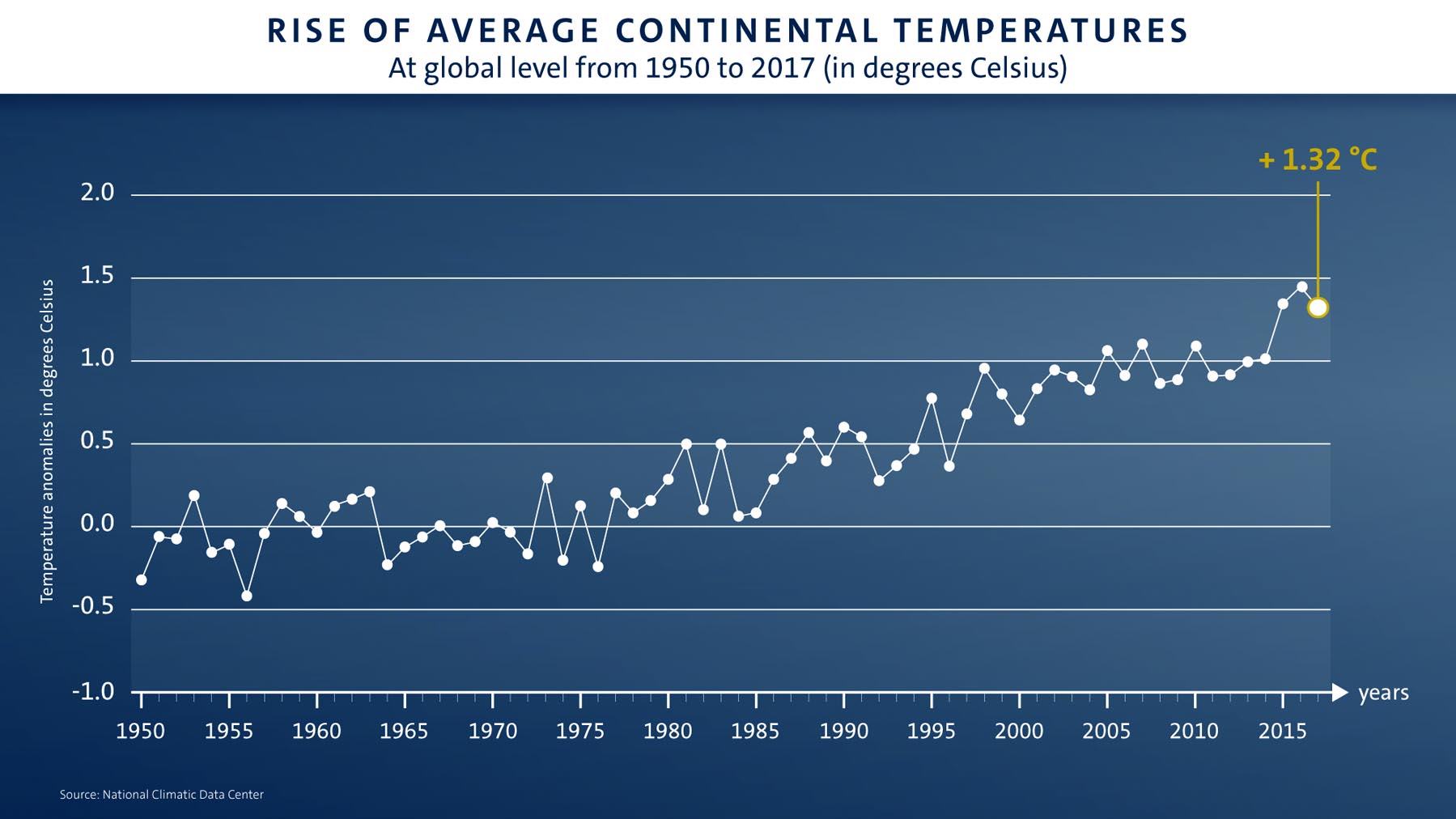 - Το κλίμα του πλανήτη ζεσταίνεται όλο και πιο γρήγορα: από το 1950, η μέση παγκόσμια θερμοκρασία έχει αυξηθεί κατά περίπου 1,32 βαθμούς Κελσίου. Από το 1850 περίπου κατά 1,53 βαθμούς Κελσίου.