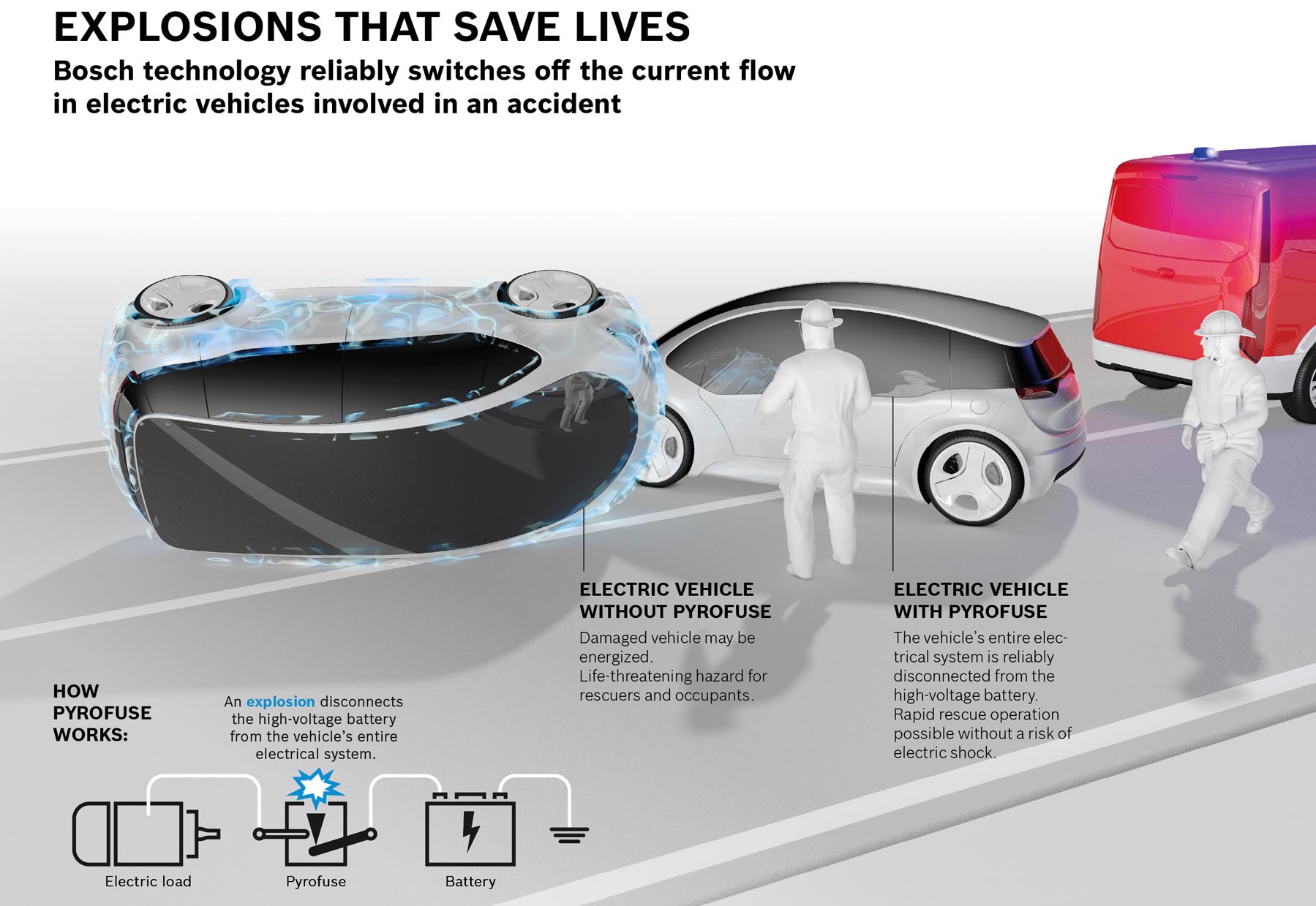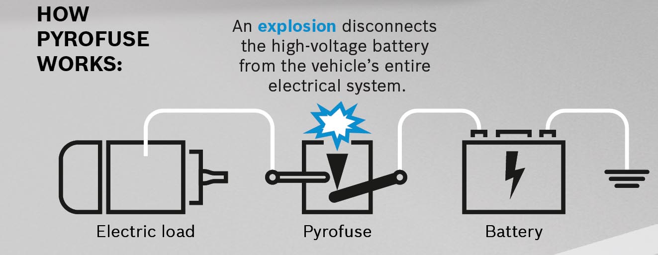 Για αυτό το λόγο υπάρχουν διάφοροι τρόποι αυτόματης διακοπής της μπαταρίας. Όπως ένα μικροτσίπ που ελέγχει μια μικρή ποσότητα εκρηκτικών. Όταν χρειαστεί το μικροτσίπ δίνει εντολή ώστε να ενεργοποιηθεί το πυροτεχνικό σύστημα και μέσα σε κλάσματα του δευτερολέπτου να προκαλέσει μία μικρή έκρηξη στο pyrofuse (όπως ονομάζει την ασφάλεια αυτή η Bosch) και να απομονώσει το κύκλωμα.