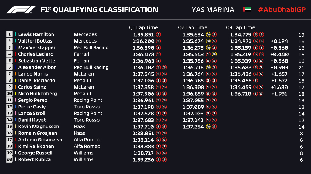 Ο Lewis Hamilton μπορεί να έχει εξασφαλίσει τον τίτλο αλλά ρυθμό δεν κόβει. Έτσι αύριο θα ξεκινήσει στο Άμπου Ντάμπι και τη Yas Arena από την πρώτη θέση, έχοντας πίσω του τον Valtteri Bottas.