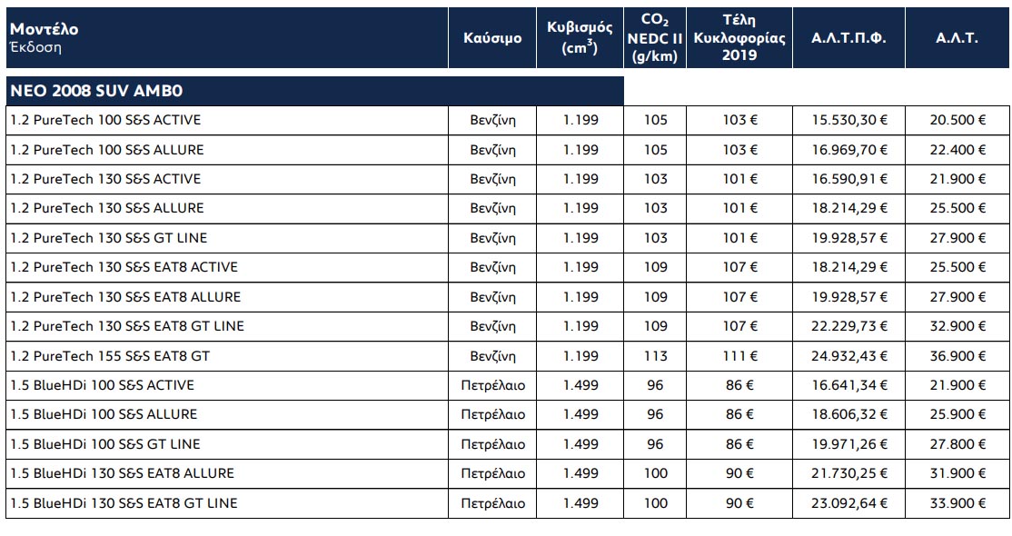 Το νέο 2008 θα είναι διαθέσιμο στην ελληνική αγορά από τον Ιανουάριο και σε τρεις εκδόσεις κινητήρων. To ηλεκτρικό e-208 (των 136 ίππων με αυτονομία 340 χλμ. στο κύκλο WLTP) θα είναι διαθέσιμο από την άνοιξη και μετά και σε πέντε εκδόσεις. Παρακάτω οι τιμές πώλησης.