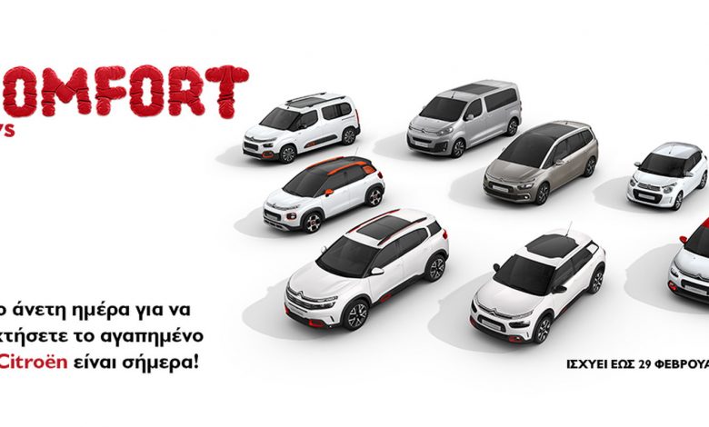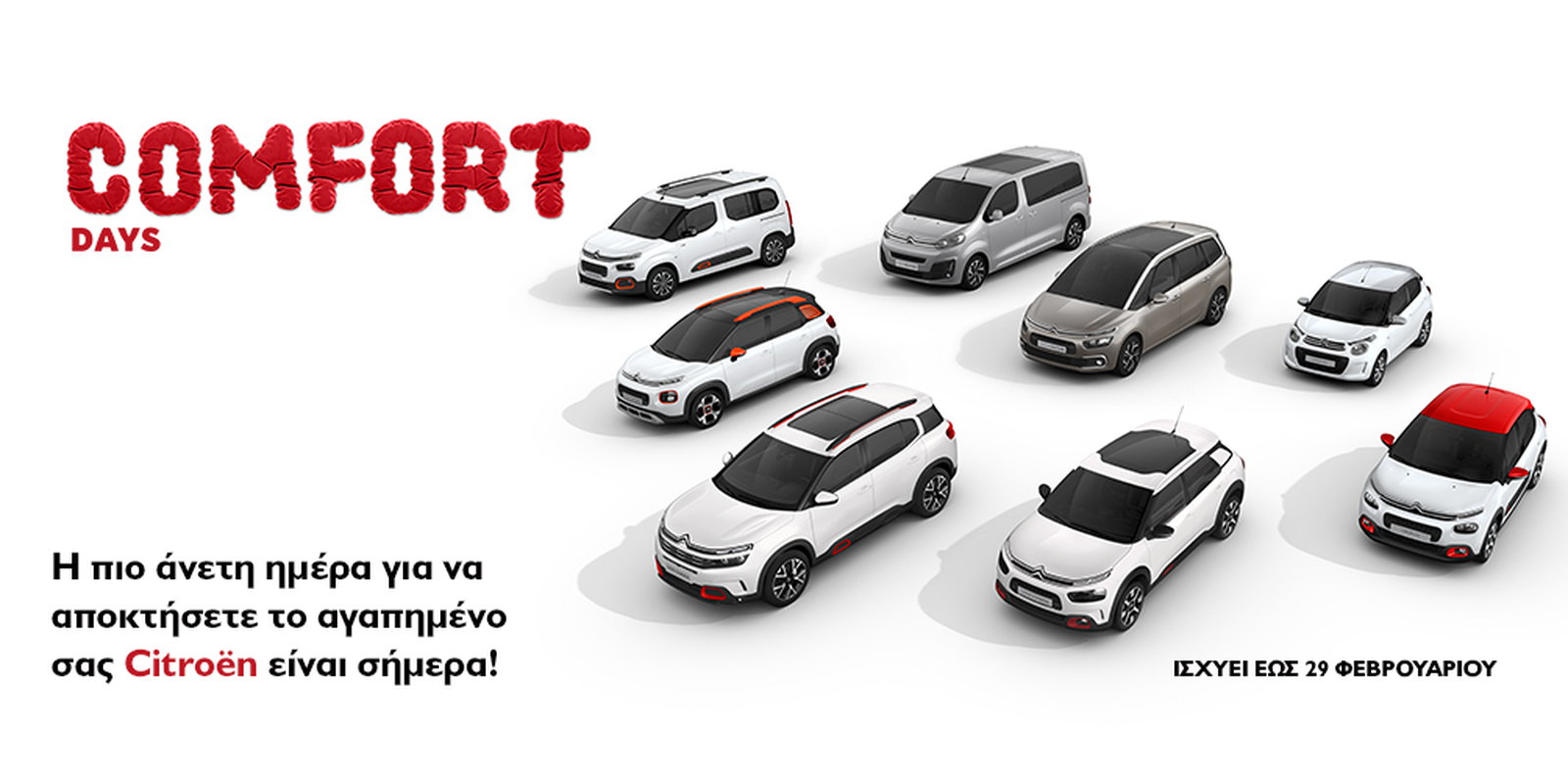 Για περισσότερες πληροφορίες, επισκεφθείτε το Επίσημο Δίκτυο Διανομέων CITROËN ή την ιστοσελίδα Citroën Comfort Days. Το πρόγραμμα Citroën Comfort Days ισχύει έως τις 29 Φεβρουαρίου 2020.
