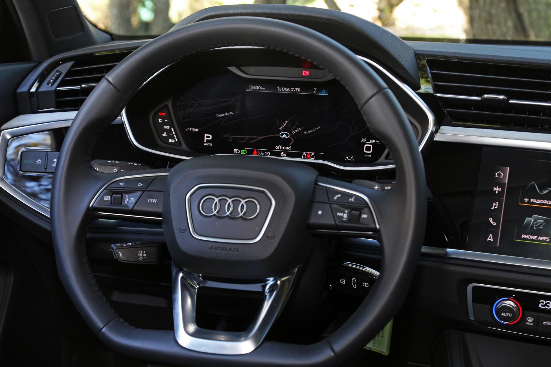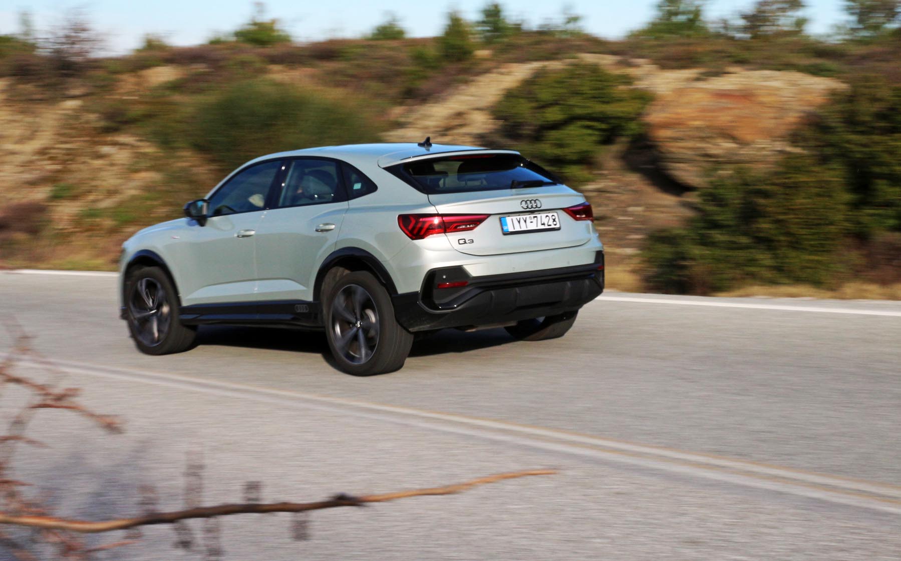 Η ποιότητα κύλισης παραμένει εξίσου υψηλή, η επιλογή όμως των διαστάσεων 225/40/20 ελαστικών, περισσότερο ευφραίνει οπτικά, παρά αντικατοπτρίζει μία ρεαλιστική επιλογή για το ελληνικό ανάγλυφο. Σταθερό σε υψηλές ταχύτητες, εύκολα ελεγχόμενο και ευχάριστο οδηγικά, το Q3 Sportback θα ικανοποιήσει. Ακόμα και το τιμόνι του, μπορεί να έχει μία κάπως επίπλαστη αίσθηση, δεν παύει όμως να παραμένει ακριβές και αρκετά σβέλτο.