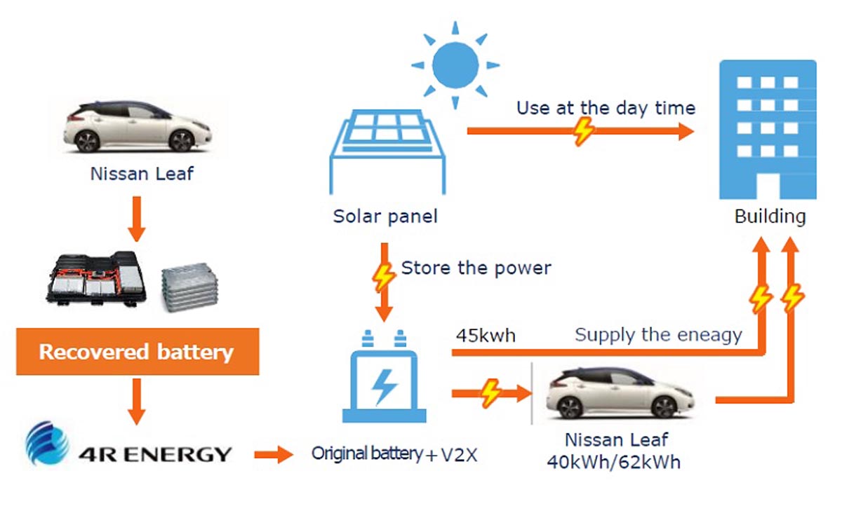 Στο πλαίσιο των προσπαθειών για την ενίσχυση της ανθεκτικότητας, η 4R Energy έχει αναπτύξει μια σταθερή μπαταρία «επανατοποθετώντας» τις χρησιμοποιημένες μπαταρίες 40 κιλοβατωρών  από τα ηλεκτρικά αυτοκίνητα  Nissan LEAF. Η εταιρεία, που είναι μια κοινοπραξία μεταξύ της Nissan και της Sumitomo Corp., έχει επίσης αναπτύξει ένα νέο προϊόν που επιτρέπει στους χρήστες  να χρησιμοποιούν ηλεκτρική ενέργεια που αποθηκεύεται σε EVs,  μέσω της τεχνολογίας V2X (Vehicle to Everything).