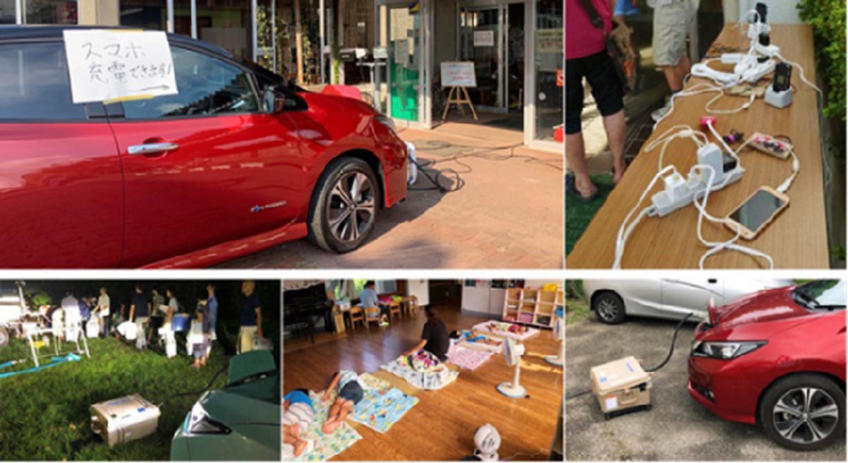 Μέχρι τα τέλη Μαρτίου του 2020, η Nissan θα έχει συνάψει 31 συμφωνίες με τοπικές κυβερνήσεις και εταιρείες σχετικά με τη χρήση των  EVs,  κατά τη διάρκεια και μετά από φυσικές καταστροφές. Οι συμφωνίες καθιστούν τα ηλεκτρικά αυτοκίνητα διαθέσιμα για τις τοπικές κοινότητες και τους πολίτες, προκειμένου  να τα  χρησιμοποιούν ως πηγές ενέργειας σε καταφύγια  και εγκαταστάσεις κοινωνικής πρόνοιας,  σε περίπτωση διακοπών που προκαλούνται από φυσικές καταστροφές. Ο σχεδιασμός περιλαμβάνει τα οχήματα που ανήκουν στις τοπικές κυβερνήσεις καθώς και εκείνα που χρησιμοποιούνται για υπηρεσίες κοινής χρήσης αυτοκινήτων και για test drives,  σε αντιπροσώπους της Nissan.