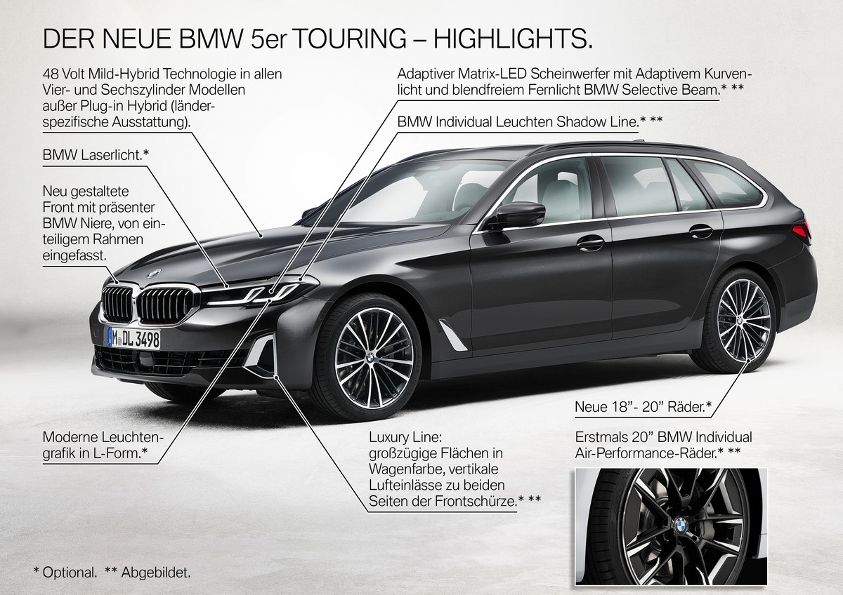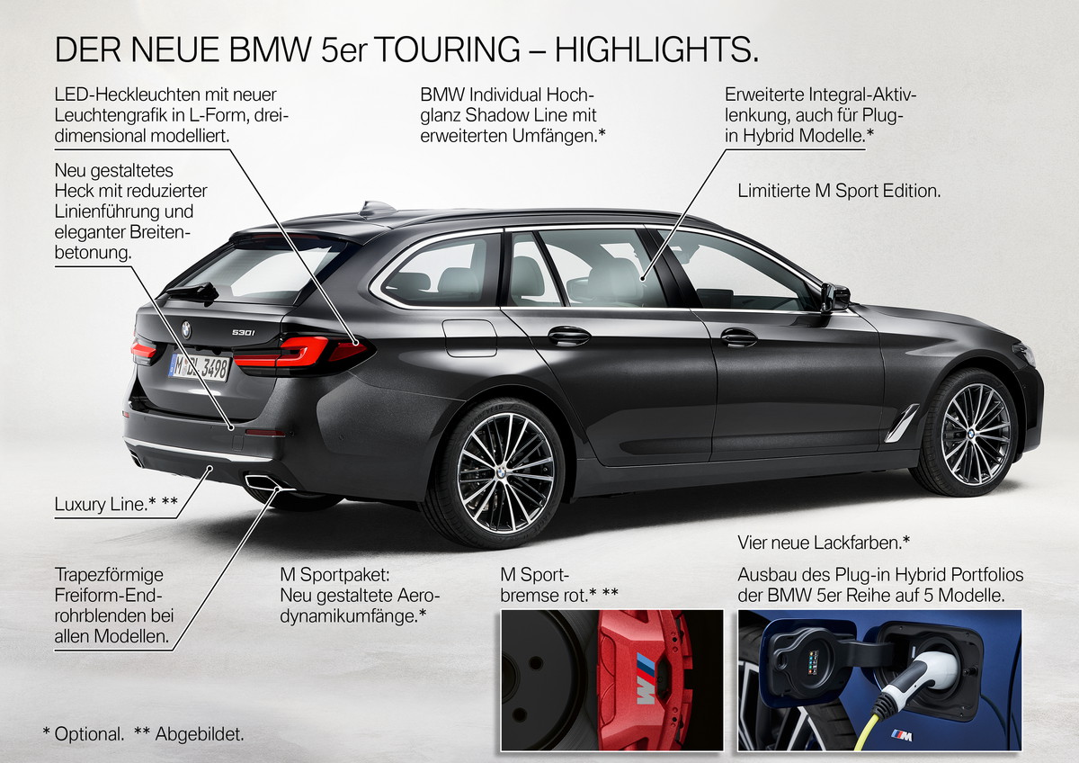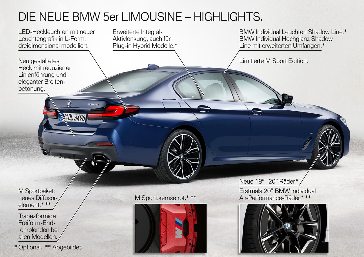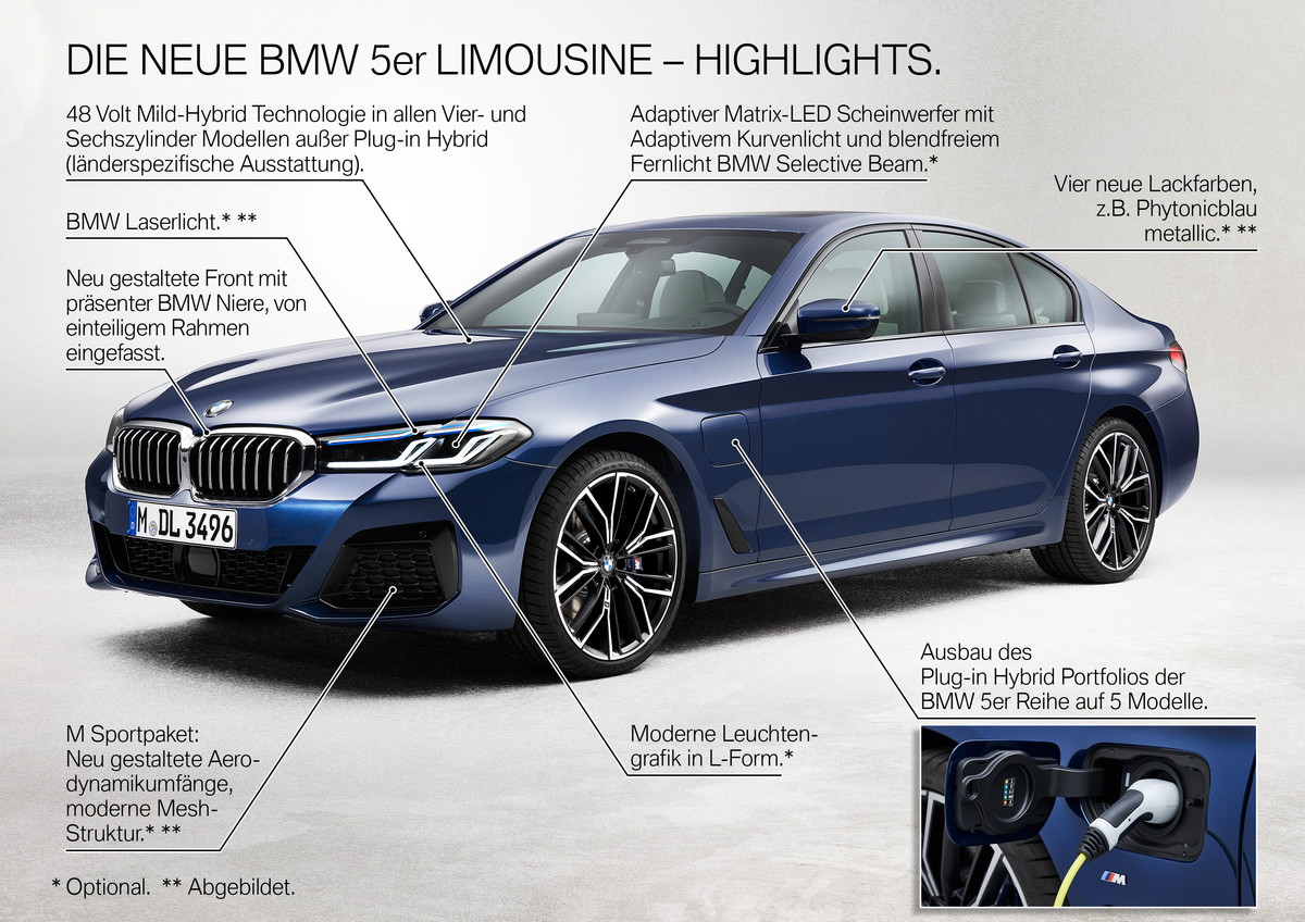 Νέα είναι η plug-in υβριδική 545e με εξακύλινδρο 3,0 lt με 286 ίππους που συνδυάζεται με ηλεκτροκινητήρα 109 ίππων. Συνδυαστικά η απόδοση είναι στους 394 ίππους και τα 600 Nm με 0-100 χλμ./ώρα σε 4,7 δλ. Η ηλεκτρική αυτονομία φτάνει τα 57 χιλιόμετρα σε ταχύτητες έως και 140 χλμ./ώρα. Συνεχίζει κανονικά, τόσο ως Sedan όσο και ως Touring (στέισον), η επίσης plug-in υβριδική 530e με ισχύ στους 292 ίππους (από 252). Το λανσάρισμα της νέας Σειράς 5 ξεκινά μέσα στο καλοκαίρι.