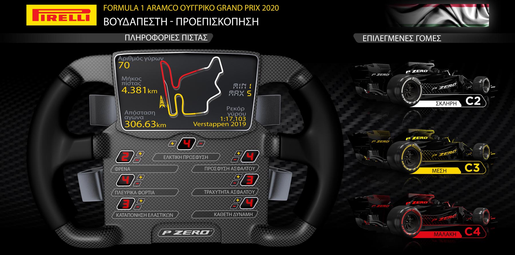 • Τα ελαστικά επίσης αντιμετωπίζουν μια πρόκληση στο Hungaroring, λόγω της αλληλουχίας των κυρίως, αργών στροφών (14). Υπάρχει μόνο μια σύντομη ευθεία στην εκκίνηση. Αυτό έχει ως αποτέλεσμα τα ελαστικά να δουλεύουν συνέχεια: Κάποιοι οδηγοί το παραλληλίζουν με τις εμπειρίες που έχουν από τους αγώνες καρτ.