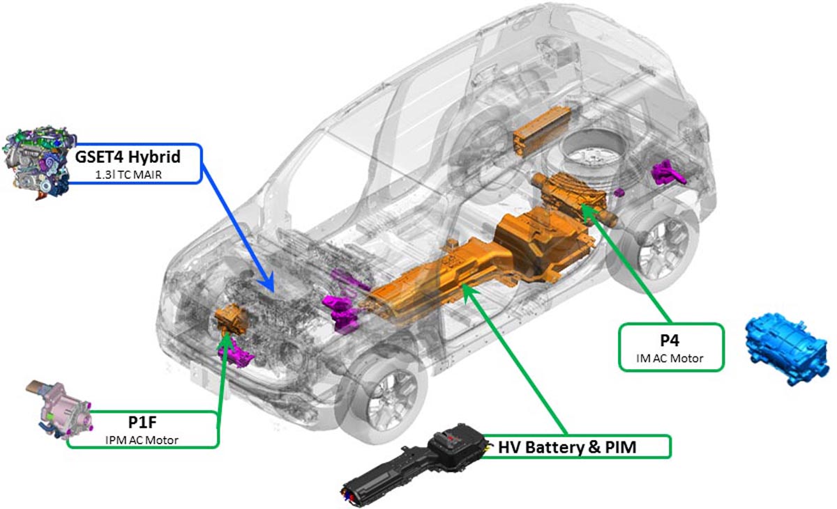 - Δύο ηλεκτροκινητήρες, ένας στον εμπρόσθιο άξονα που είναι συνδεδεμένος με τον βενζινοκινητήρα και λειτουργεί και ως γεννήτρια και ένας στον πίσω άξονα με ενσωματωμένο διαφορικό (“e-axle”) που αποδίδει 60 ίππους και 250 Nm ροπής και ο οποίος ανακτά ενέργεια κατά την επιβράδυνση.