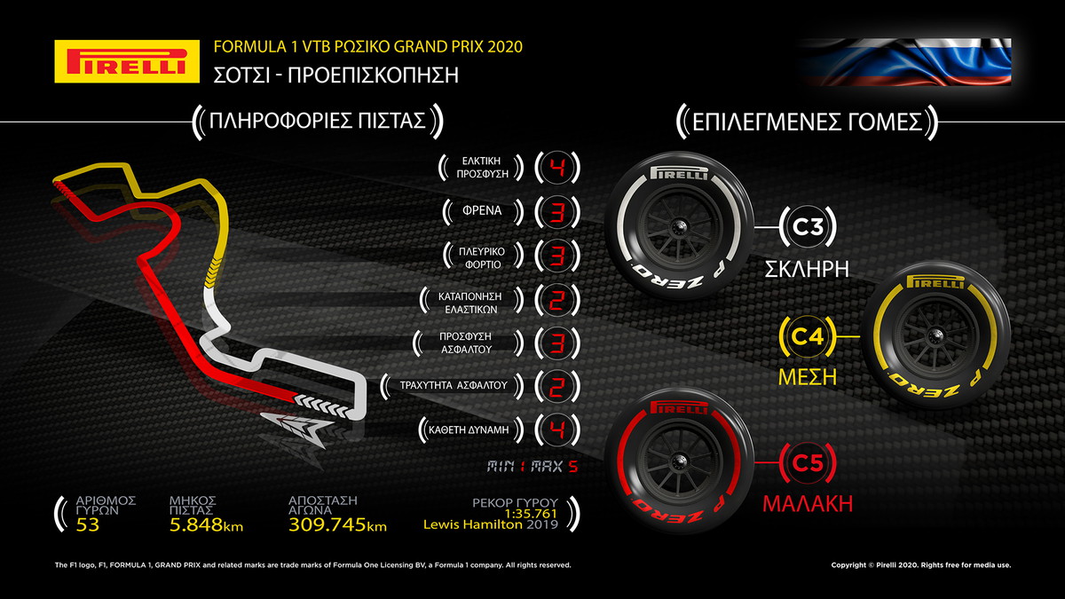 «Το Ρώσικο Grand Prix είναι ένας από τους λίγους φετινούς αγώνες που παρέμειναν στην αρχικώς προκαθορισμένη ημερομηνία τους, την ίδια εποχή με πέρυσι. Η φετινή μας επιλογή είναι ένα επίπεδο πιο μαλακή από του 2019. Στόχος να δώσουμε έξτρα ταχύτητα και να προσθέσουμε μια πρόκληση όσον αφορά στη στρατηγική ελαστικών. Χάρη στο πιο λεπτό πέλμα που υιοθετήθηκε το 2019, η επιλογή των πιο μαλακών γομών C3, C4, C5 θα πρέπει να ενθαρρύνει τη χρήση και των τριών γομών, χωρίς να χρειαστεί ιδιαίτερη διαχείριση από τους οδηγούς κατά τη διάρκεια του αγώνα. Η στρατηγική του περσινού αγώνα επηρεάστηκε από το αυτοκίνητο ασφαλείας, επιπλέον τα μονοθέσια του 2020 είναι πιο γρήγορα. Οπότε οι ομάδες πρέπει να υπολογίσουν μερικές άγνωστες παραμέτρους στο φετινό Ρωσικό Grand Prix. Τούτου δοθέντος το Sochi δεν έχει μεγάλες απαιτήσεις από τα ελαστικά, οπότε η στρατηγική μιας αλλαγής είναι πιθανή. Οι ομάδες θα δουλέψουν κατά τη διάρκεια των ελεύθερων δοκιμών για να διαπιστώσουν αν αυτή παραμένει η ταχύτερη στρατηγική: Πιστεύουμε ότι η μια αλλαγή θα είναι η πιο δημοφιλής επιλογή καθώς οι ομάδες την επιδιώκουν όπου είναι εφικτή».