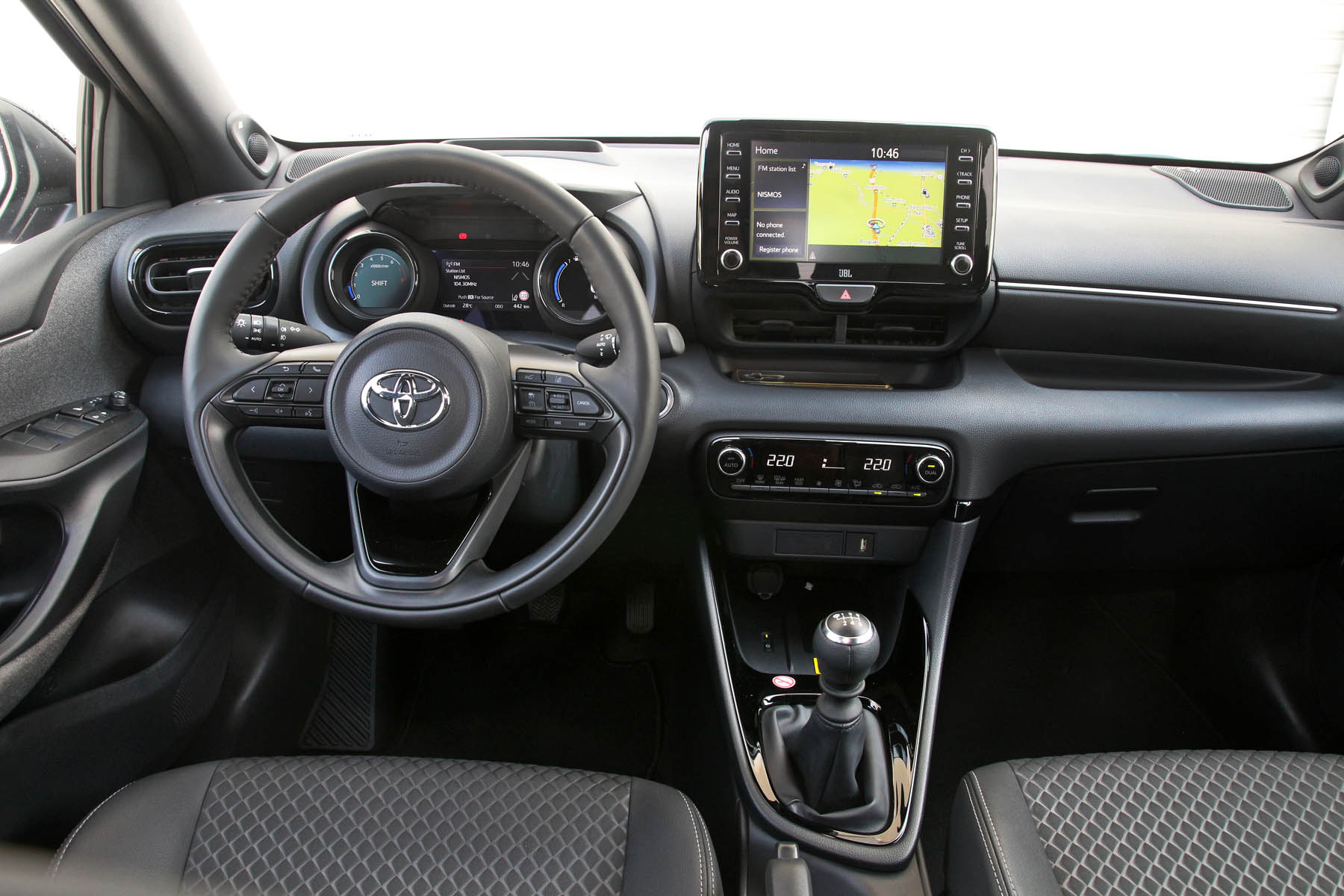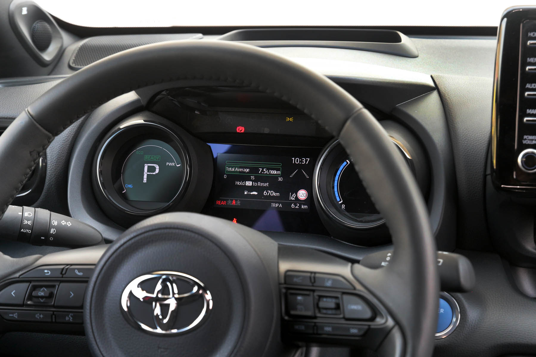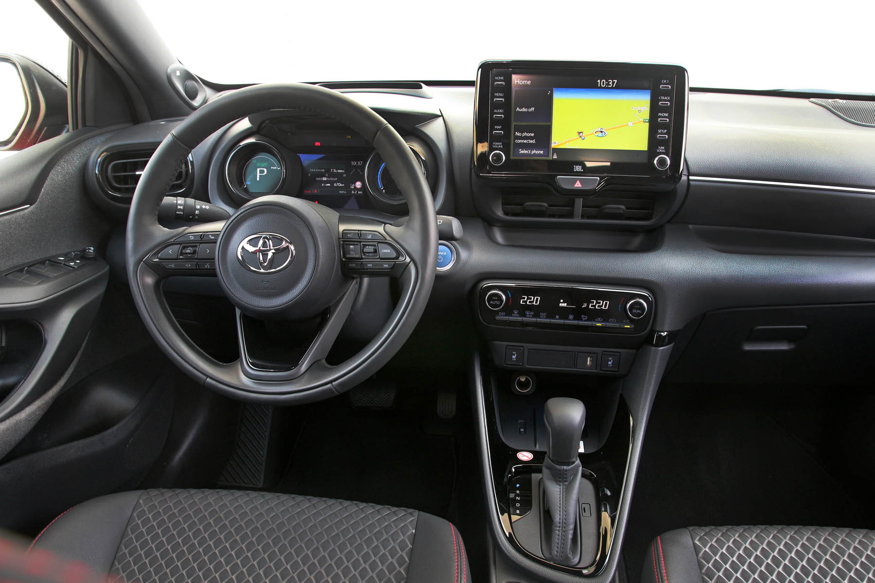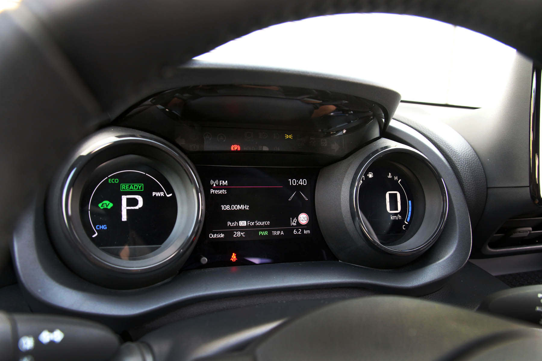 Το ταμπλό ακολουθεί τη νεανική σχεδίαση του απέξω και έχει μοντέρνο ντιζάιν, όπως ο πίνακας οργάνων με τα δύο ανεξάρτητα ψηφιακά όργανα και ανάμεσά τους μια οθόνη πολλαπλών πληροφοριών. Στην μέση του ταμπλό υπάρχει μια «ελεύθερη» οθόνη αφής 7” η οποία πολύ σωστά περιβάλλεται από τους βασικούς διακόπτες. Οι οποίοι θα μπορούσε να είναι κάπως πιο σικ, ενώ και η ποιότητα των γραφικών θα μπορούσε να είναι καλύτερη (στο υβριδικό υπάρχει και το αντίστοιχο μενού πληροφοριών).