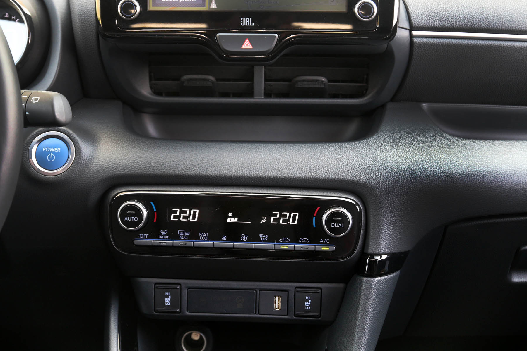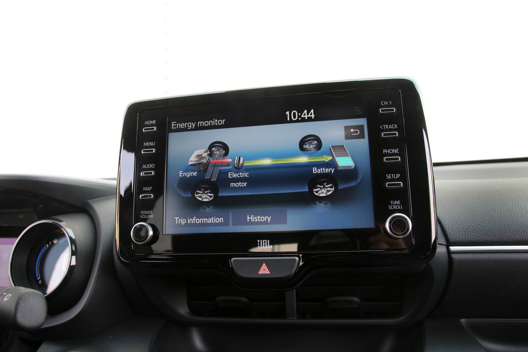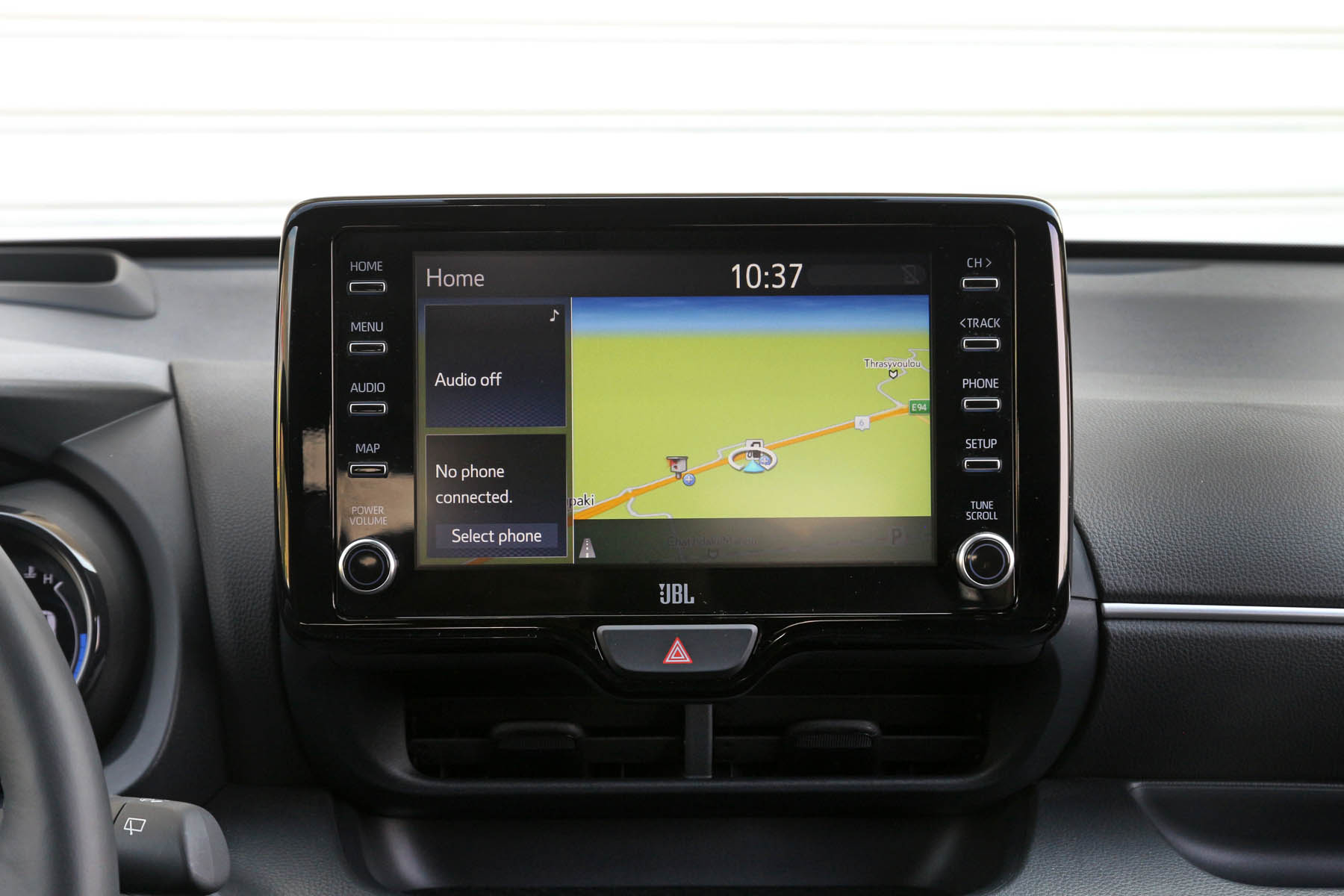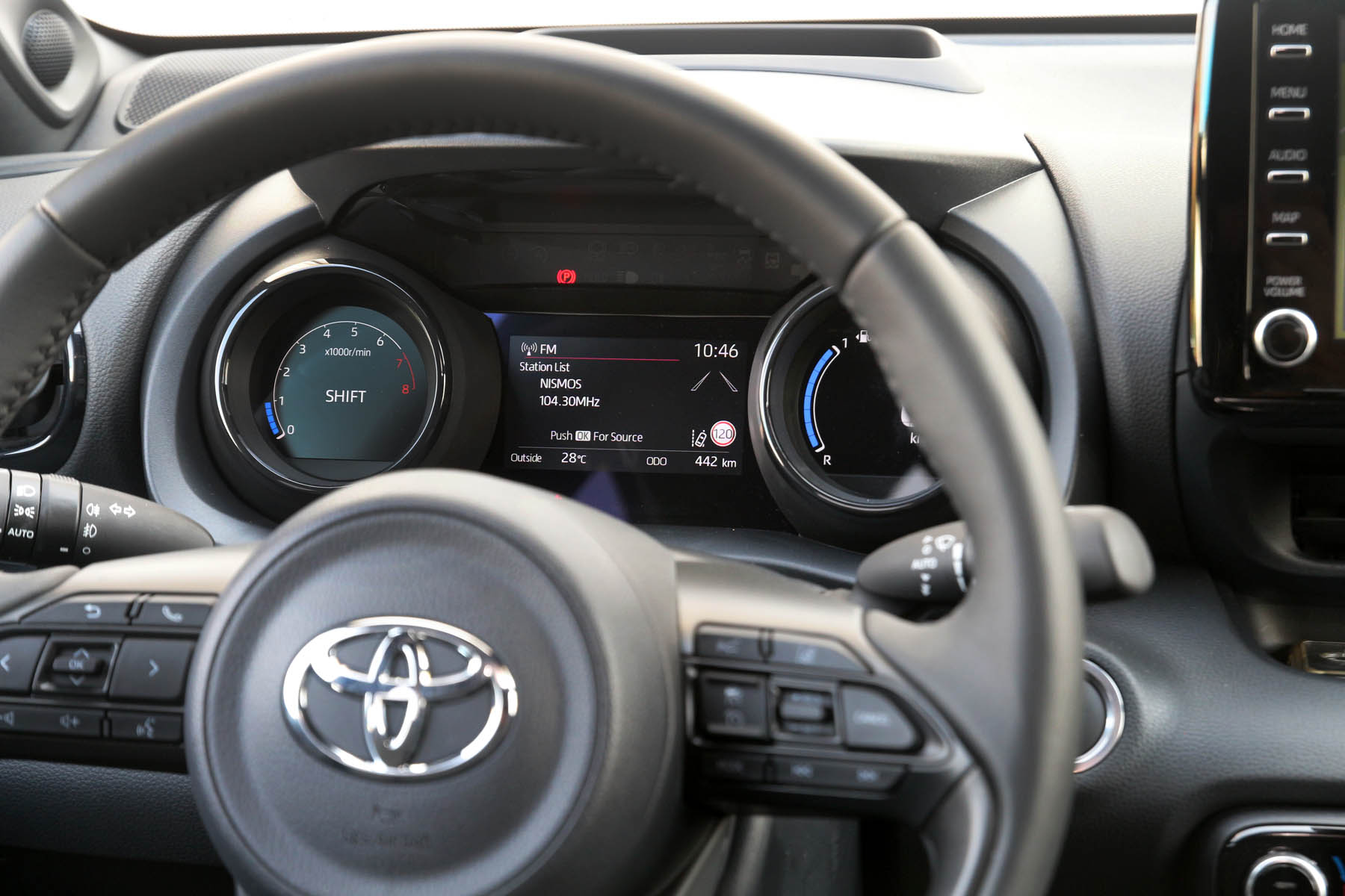 Το ταμπλό ακολουθεί τη νεανική σχεδίαση του απέξω και έχει μοντέρνο ντιζάιν, όπως ο πίνακας οργάνων με τα δύο ανεξάρτητα ψηφιακά όργανα και ανάμεσά τους μια οθόνη πολλαπλών πληροφοριών. Στην μέση του ταμπλό υπάρχει μια «ελεύθερη» οθόνη αφής 7” η οποία πολύ σωστά περιβάλλεται από τους βασικούς διακόπτες. Οι οποίοι θα μπορούσε να είναι κάπως πιο σικ, ενώ και η ποιότητα των γραφικών θα μπορούσε να είναι καλύτερη (στο υβριδικό υπάρχει και το αντίστοιχο μενού πληροφοριών).