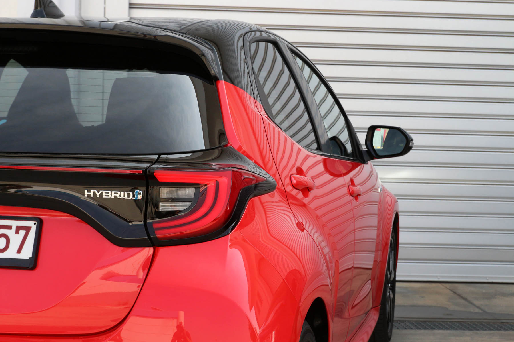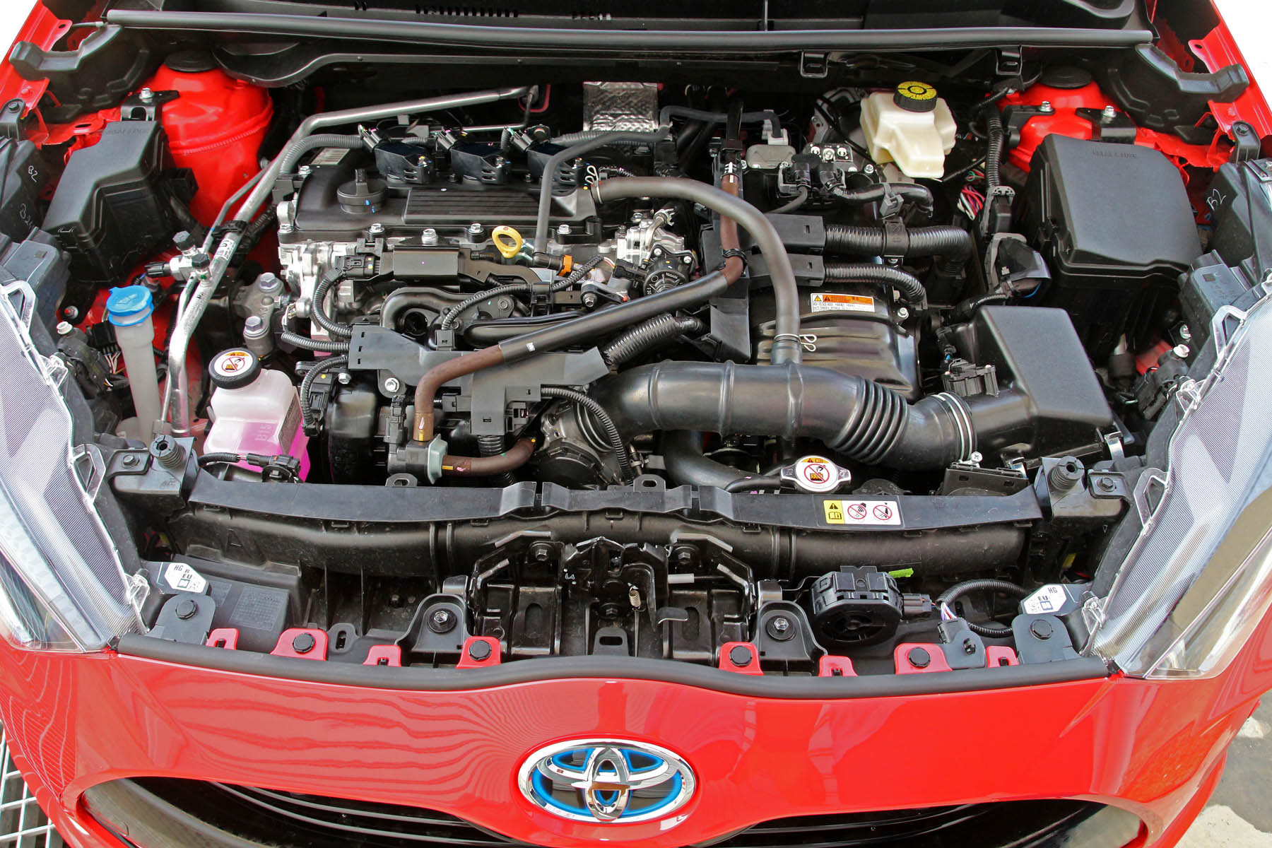 Στο υβριδικό, κόκκινο, Yaris το ίδιο μοτέρ (αλλά με άλλη αλά Atkinson χαρτογράφηση που ρίχνει την ισχύ στους 91 ίππους) συνδυάζεται με το εξελιγμένο hybrid σύστημα της Toyota (με ηλεκτρικό μοτέρ 80 ίππων) για μια συνδυασμένη ισχύ στα 116 άλογα. Η λειτουργία του e-CVT είναι βελτιωμένη και σε συνδυασμό με την καλύτερη ηχομόνωση ο θόρυβος που μπαίνει στην καμπίνα κατά την απότομη επιτάχυνση είναι αισθητά λιγότερος (πάντα σε σχέση με το προηγούμενο Yaris). Όταν κινείσαι νορμάλ τα ντεσιμπέλ πέφτουν πολύ χαμηλά, όπως και η κατανάλωση που με λίγη προσοχή πέφτει πολύ εύκολα κάτω από τα 5 λίτρα/100 χλμ. Ειδικά στο πρόγραμμα Eco ( υπάρχει το EV και το Power) μπορείς να κινείσαι γύρω από τα 4.