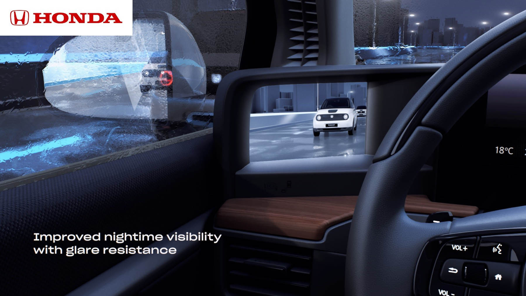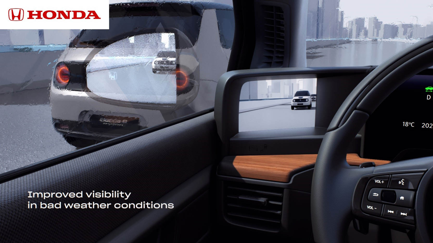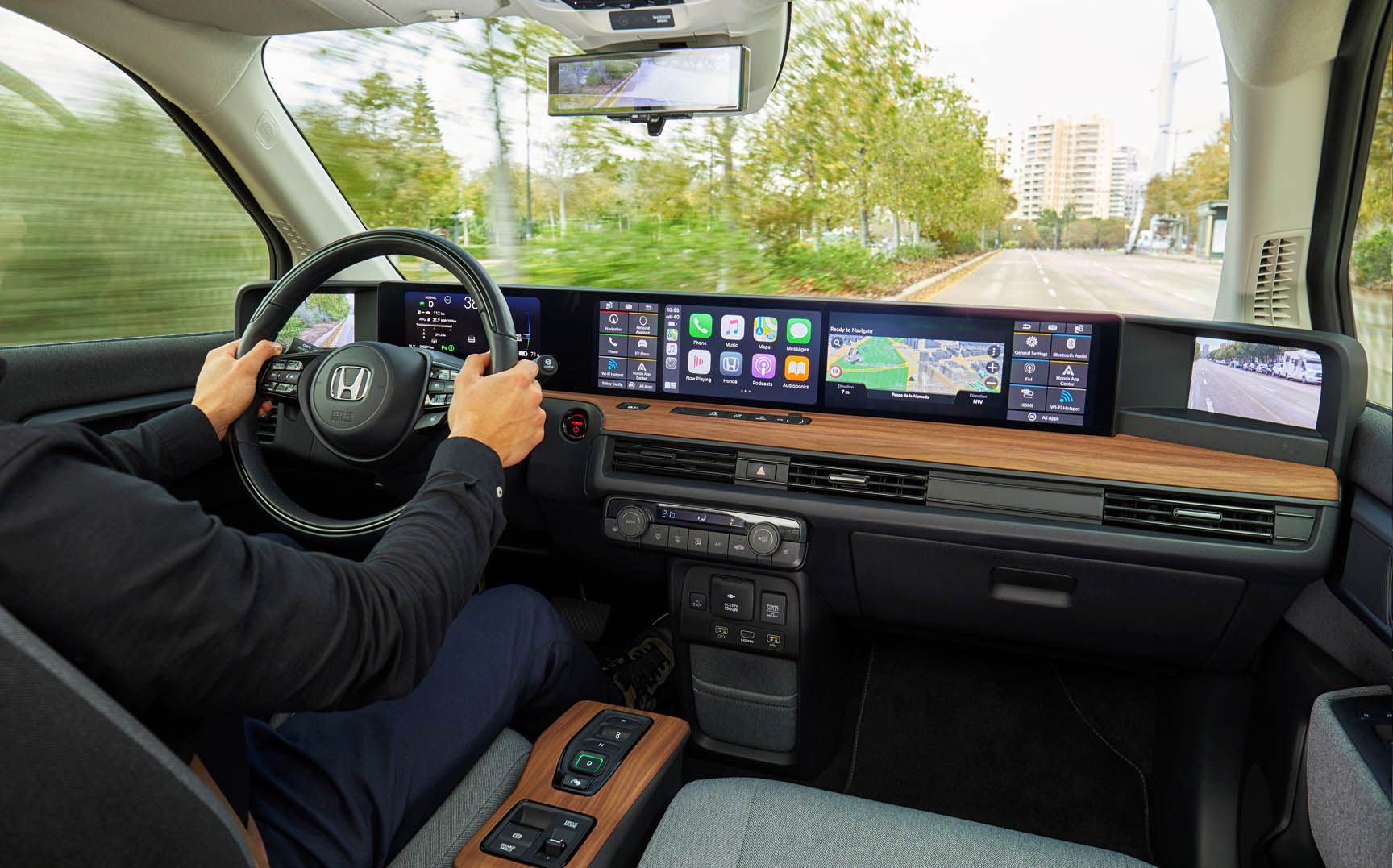 Στην θέση των εξωτερικών καθρεπτών υπάρχουν στάνταρ μικρό-κάμερες που απεικονίζουν ότι αυτές «βλέπουν» σε δυο οθόνες στα άκρα του ταμπλό. Οι οποίες είναι στην σωστή θέση, έχουν μια πιο ρεαλιστική και αξιόπιστη απεικόνιση και κάνουν την δουλειά τους πολύ καλύτερα απ’ ότι στο Audi E-Tron. Από οθόνες, πάντως, το Honda e το «τερματίζει» αφού έχει από τις περισσότερες που μπορεί να υπάρξουν σε ένα citycar: μαζί με τις τρεις που αντικαθιστούν τους καθρέπτες (υπάρχει και αυτή της οπισθοπορείας που χρίζει κάποιο χρόνο εξοικείωσης) υπάρχουν κατά μήκος του ταμπλό ακόμη τρεις. Πέρα από την οθόνη του πίνακα οργάνων, οι άλλες δύο είναι αφής 12,3’’ και τρέχουν σε ένα περιβάλλον ανάλογο ενός smartphone ώστε να το συνηθίζεις εύκολα και με πολύ όμορφα γραφικά.