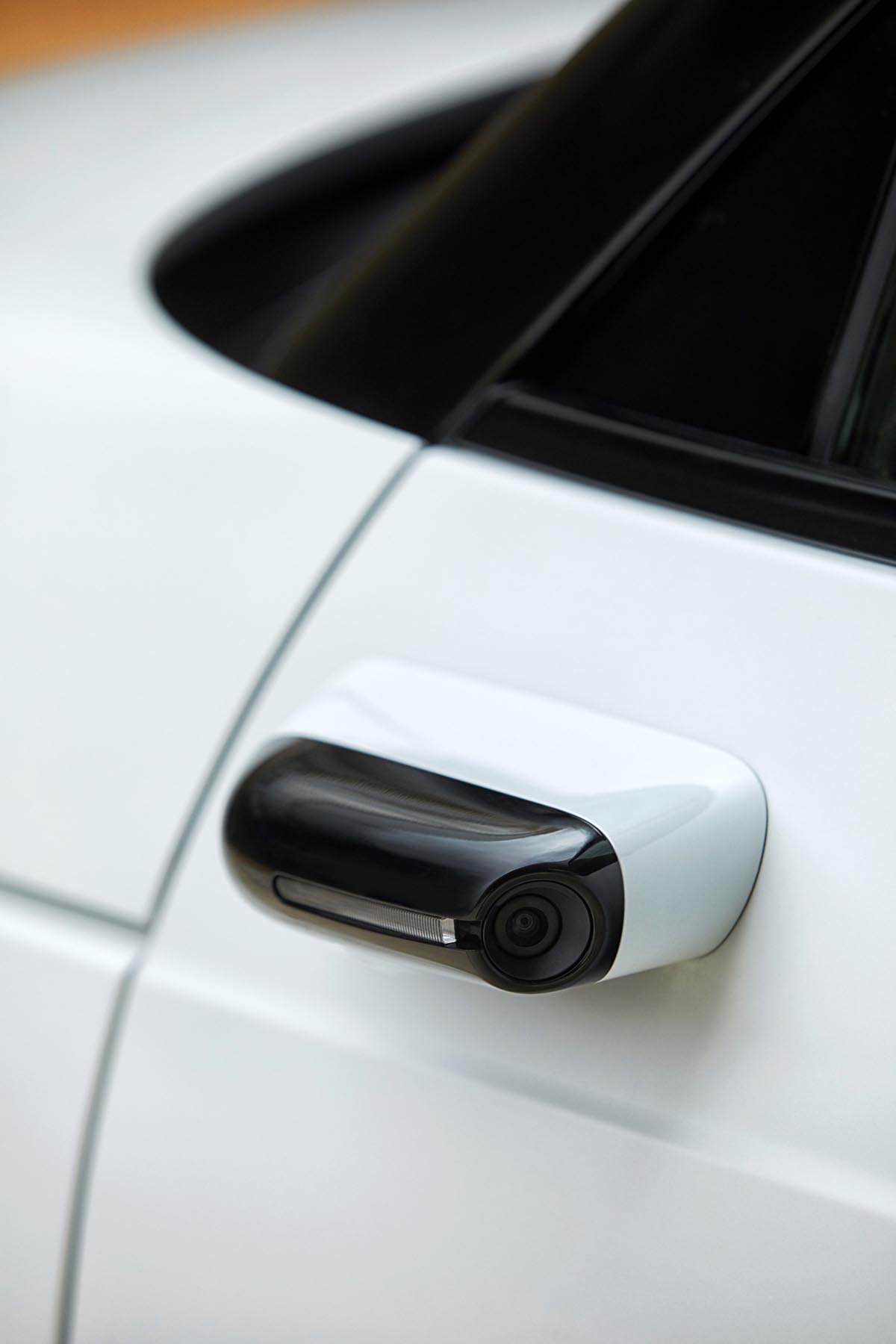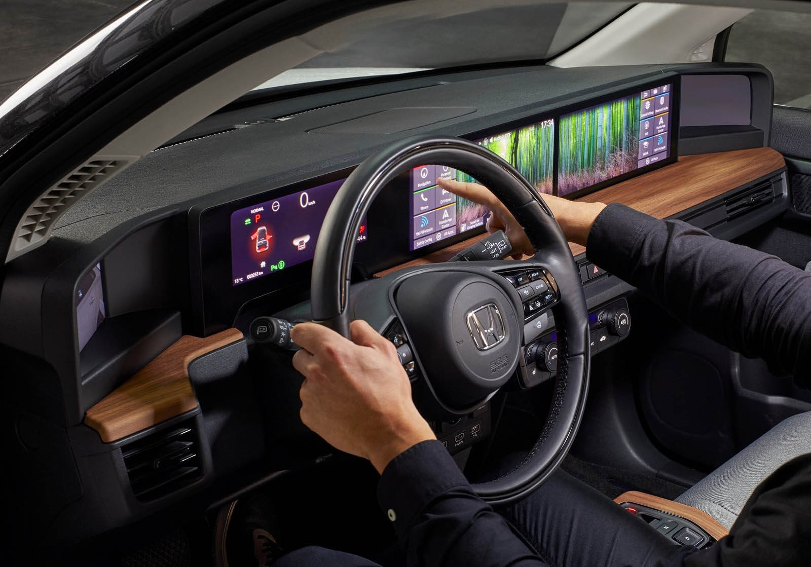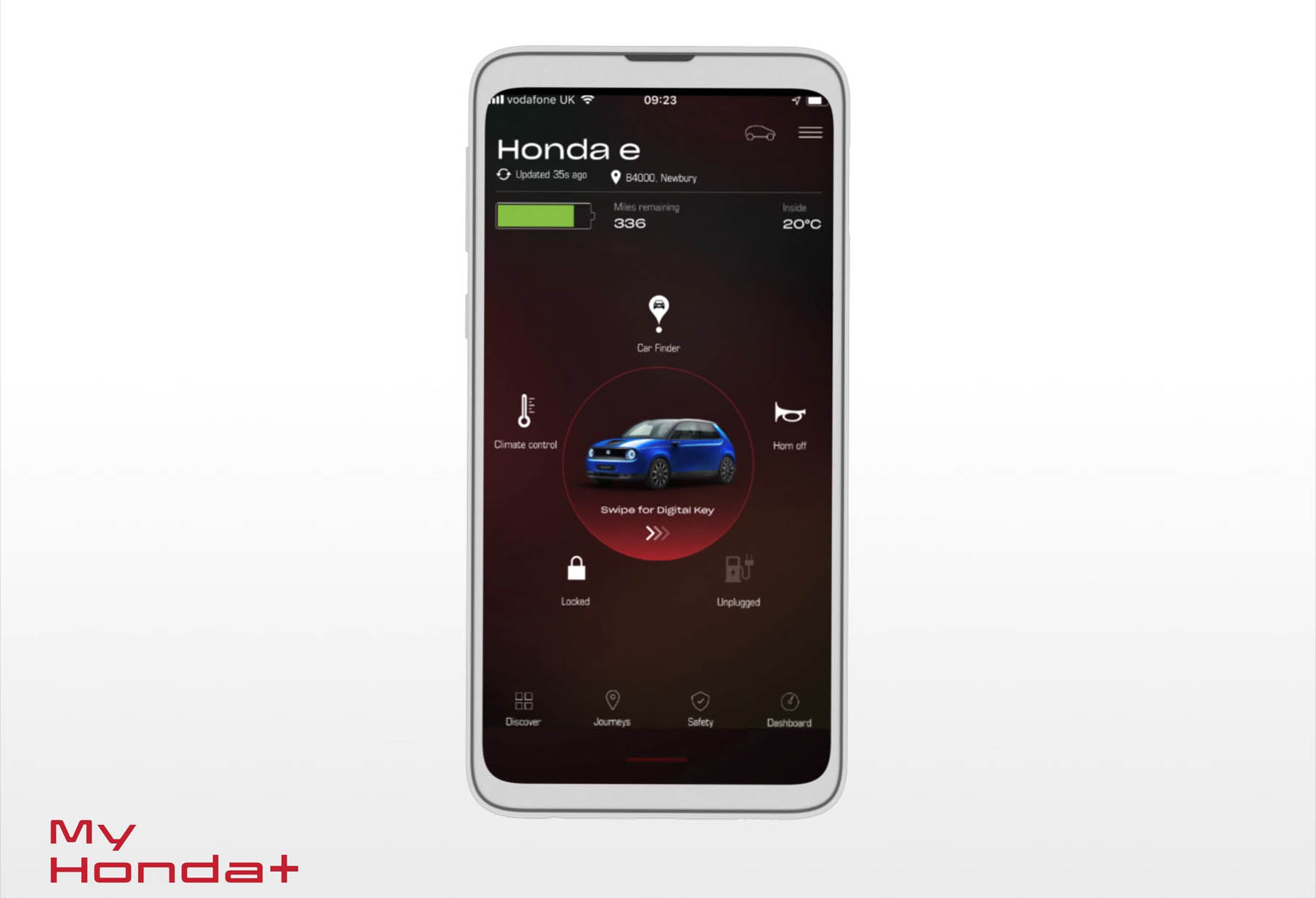Στην θέση των εξωτερικών καθρεπτών υπάρχουν στάνταρ μικρό-κάμερες που απεικονίζουν ότι αυτές «βλέπουν» σε δυο οθόνες στα άκρα του ταμπλό. Οι οποίες είναι στην σωστή θέση, έχουν μια πιο ρεαλιστική και αξιόπιστη απεικόνιση και κάνουν την δουλειά τους πολύ καλύτερα απ’ ότι στο Audi E-Tron. Από οθόνες, πάντως, το Honda e το «τερματίζει» αφού έχει από τις περισσότερες που μπορεί να υπάρξουν σε ένα citycar: μαζί με τις τρεις που αντικαθιστούν τους καθρέπτες (υπάρχει και αυτή της οπισθοπορείας που χρίζει κάποιο χρόνο εξοικείωσης) υπάρχουν κατά μήκος του ταμπλό ακόμη τρεις. Πέρα από την οθόνη του πίνακα οργάνων, οι άλλες δύο είναι αφής 12,3’’ και τρέχουν σε ένα περιβάλλον ανάλογο ενός smartphone ώστε να το συνηθίζεις εύκολα και με πολύ όμορφα γραφικά.