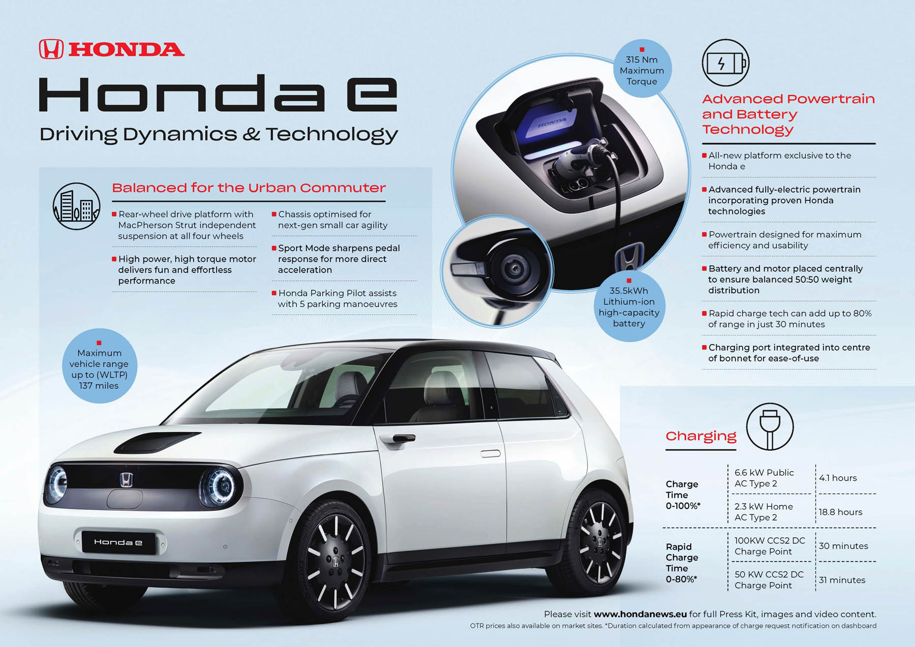 Το μικρό ηλεκτρικό της Honda έχει όλα τα χαρακτηριστικά ενός καλοστημένου και ευχάριστου οδηγικά αυτοκινήτου έχοντας ως βάση ένα εξαιρετικά δύσκαμπτο πλαίσιο με κατανομή βάρους 50/50. Τα τέσσερα McPherson της ανάρτησης διασφαλίζουν τα απαιτούμενα επίπεδα άνεσης και πολύ καλά δυναμικά χαρακτηριστικά με το ηλεκτρικό μοτέρ (ροπής 335 Nm και στις δύο εκδόσεις ισχύος) να μεταφέρει βρίσκεται στον πίσω άξονα όπου μεταφέρεται και η κίνηση.