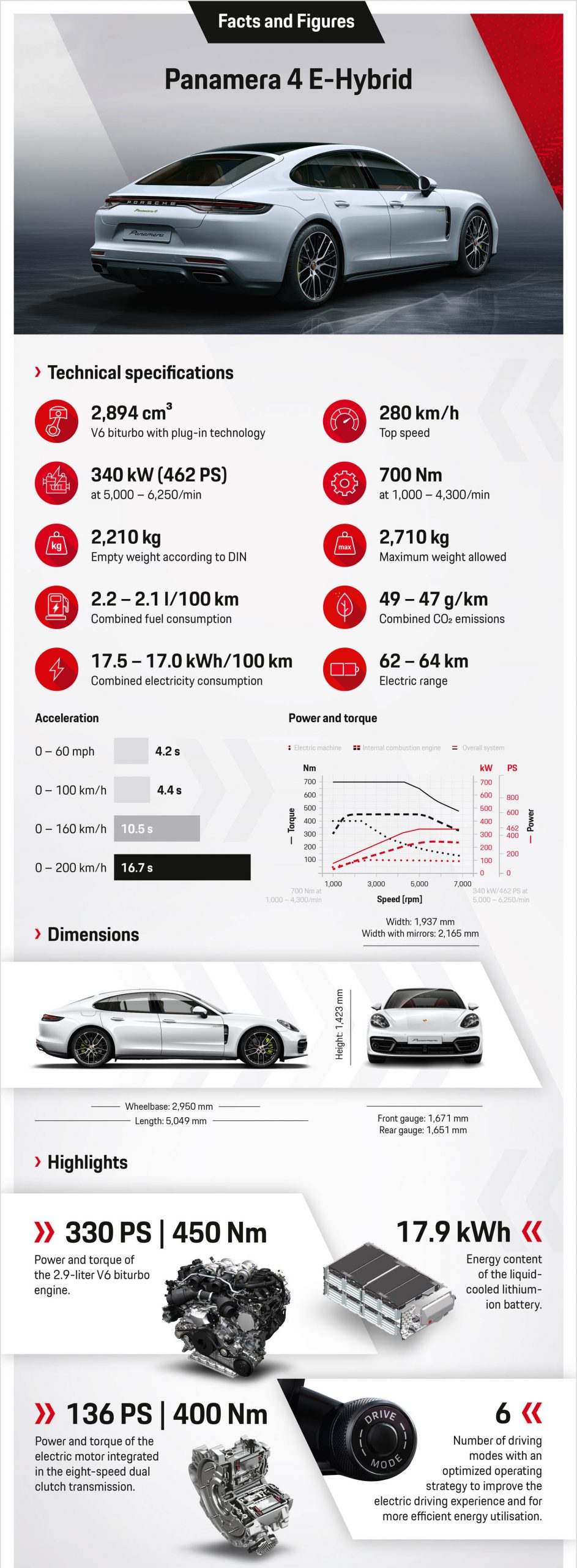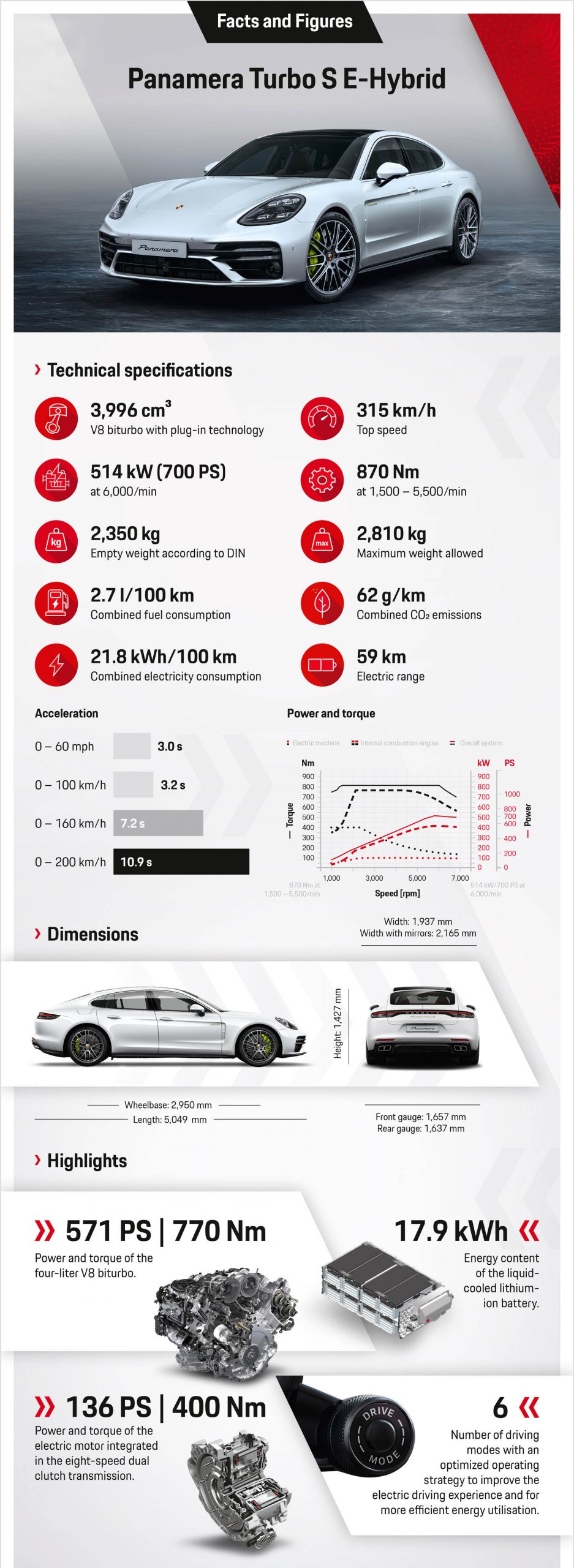 Η ανανεωμένη Panamera είχε παρουσιαστεί το καλοκαίρι και τώρα η Porsche ανακοινώνει τρεις νέες εκδόσεις καθώς και την ισχυρότερη Turbo S E-Hybrid, η οποία μετά την ηλεκτρική Taycan είναι η πιο δυνατή Porsche που υπάρχει στο τιμοκατάλογο. Ως plug-in υβριδικό συνδυάζει τον τετράλιτρο biturbo V8 που αποδίδει 571 άλογα με ένα ηλεκτρικό μοτέρ 136 ίππων με την συνολική ισχύς να φτάνει τους 700 ίππους και η ροπή τα 870 Nm.