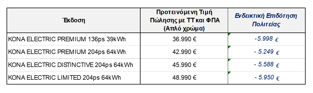Αξιοσημείωτη είναι και η έκταση τεχνικής υποστήριξης του Επισήμου Δικτύου Hyundai στο ΚΟΝΑ Electric, που εξασφαλίζει για τους κατόχους ΚΟΝΑ Electric τη δυνατότητα συντήρησης, τεχνικών ελέγχων και επισκευών από πιστοποιημένο προσωπικό ανά την Ελλάδα. Η τιμολογιακή πολιτική του μοντέλου έχει τιμή εκκίνησης 36.990€ στην έκδοση Premium 39 kWh και τις επόμενες εκδόσεις να διατίθενται ως εξής: