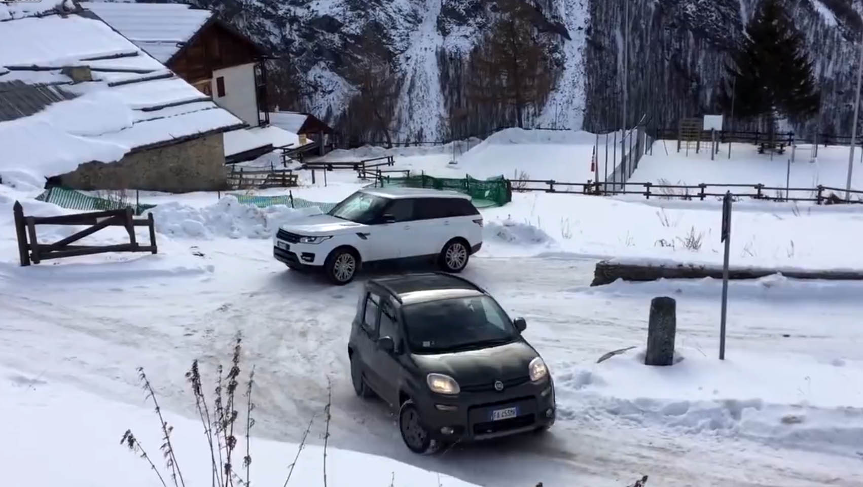 Ο οδηγός του Land Rover μάταια προσπαθεί να ανέβει την ανηφορική στροφή αφού οι τροχοί γυρίζουν και τα λάστιχα δεν βρίσκουν πρόσφυση. Πίσω του ακολουθεί ένα ταπεινό Fiat Panda που ντροπιάζει το πανάκριβο SUV κορνάροντας του για να περάσει από δίπλα του. Αξιοσημείωτο είναι πως το τετρακίνητο Panda περνά από το εσωτερικό απάτητο μέρος της στροφής.
