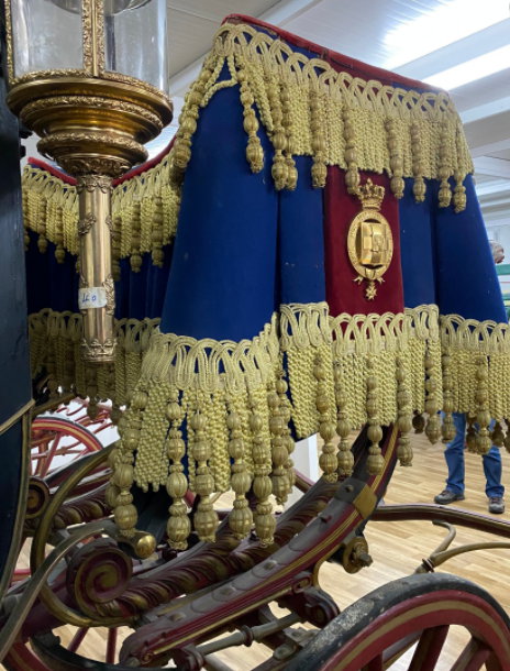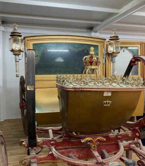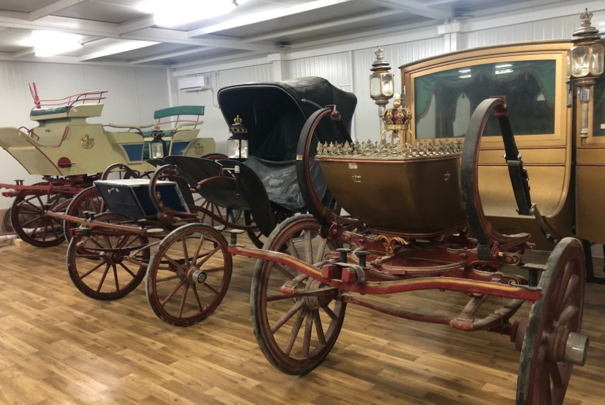 Πρόκειται για 12 άμαξες, με σημαντικότερες δυο από αυτές: την κλειστή άμαξα που χρησιμοποιήθηκε στον γάμο της Βασίλισσας Σοφίας της Ισπανίας, τύπου coach -είχε αγοραστεί από τον βασιλιά Γεώργιο Α’ το 1871- και την ειδικά τροποποιημένη, ανοιχτή άμαξα, τύπου landau, που χρησιμοποιήθηκε στους γάμους του τ. Βασιλιά Κωνσταντίνου και της Άννας Μαρίας. Επίσης, περιλαμβάνονται μια χρυσή άμαξα τύπου Coupe, 3 άμαξες τύπου Berlin, 2 ανοιχτές τύπου Phaethon, μία κυνηγετική και 3 μόνιππα.