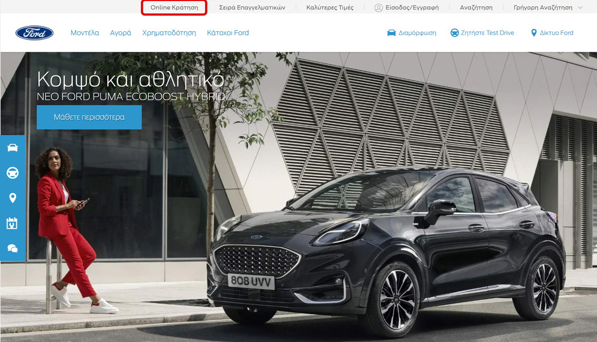 Για να μεταβείτε στο Ford Marketplace και να κλείσετε εύκολα, γρήγορα και με ασφάλεια το νέο σας Ford μεταβείτε στην επίσημη ιστοσελίδα της Ford και επιλέξτε Online Κράτηση: https://www.ford.gr/ -> Online Κράτηση
