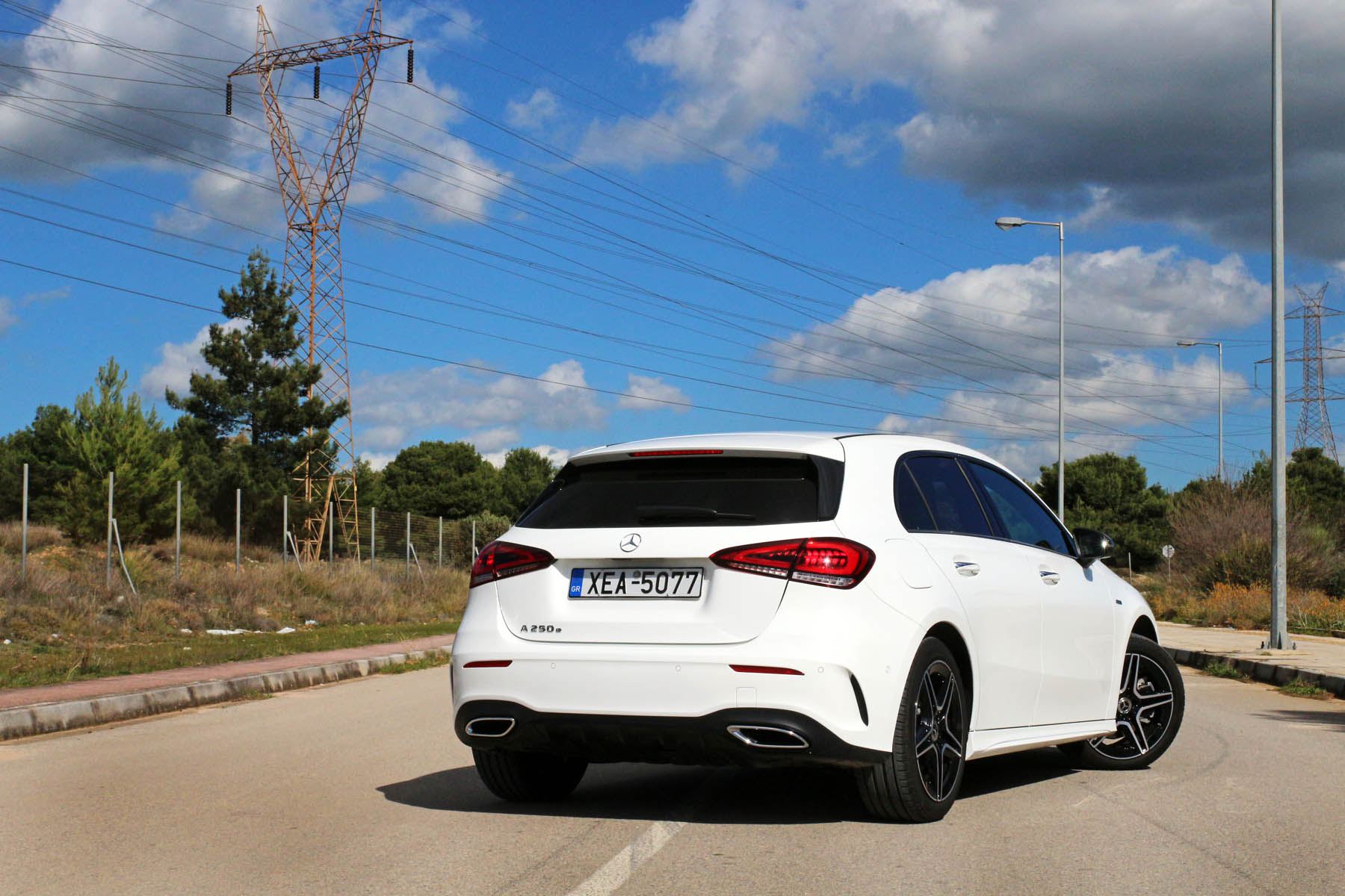 Έχοντας μικρή εμπειρία από plug-in υβριδικά μοντέλα έτερων κατασκευαστών, το πρώτο πράγμα που γίνεται σαφές στην πρώτη επαφή με την A250 e είναι η δυναμική σιλουέτα της μικρής Mercedes, που τονίζεται από τις ζάντες των 18 ιντσών χαμηλού προφίλ. Πέρα από το κάλυμμα της τάπας της βενζίνης, υπάρχει ένα επιπλέον από τη δεξιά πλευρά του αμαξώματος. Αυτό της υποδοχής φόρτισης και όλα πλέον αποκτούν νόημα όταν βρεθείς πίσω από το τιμόνι της προσθιοκίνητης Mercedes και πατήσεις το start button.