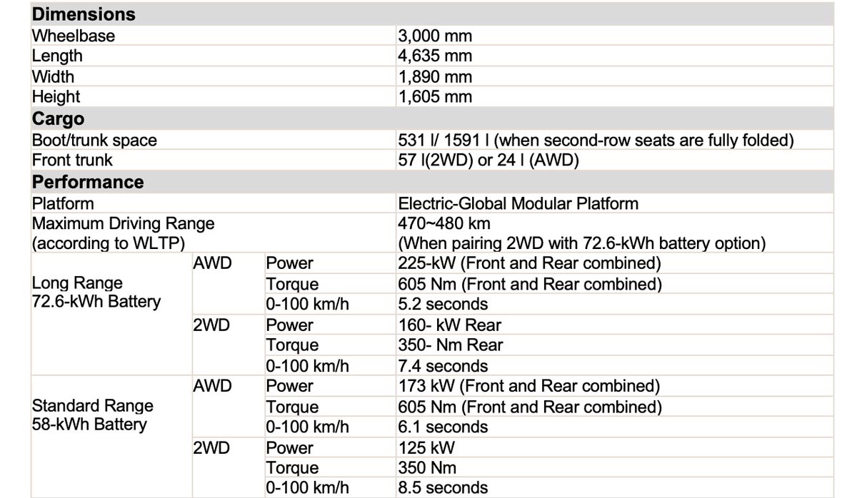Με την μεγαλύτερη μπαταρία 72,6 kWh η πισωκίνητη 2WD έκδοση των 160 kW/ 350 Nm έχει το 0-100 σε 7,4 δλ.. Εδώ η αυτονομία είναι στα 470-480 χιλιόμετρα. Η τετρακίνητη AWD των 225 kW/ 605 Nm (με μοτέρ μπροστά 70 kW και πίσω 155 kW) είναι η ταχύτερη με 0-100 σε 5,2 δλ.