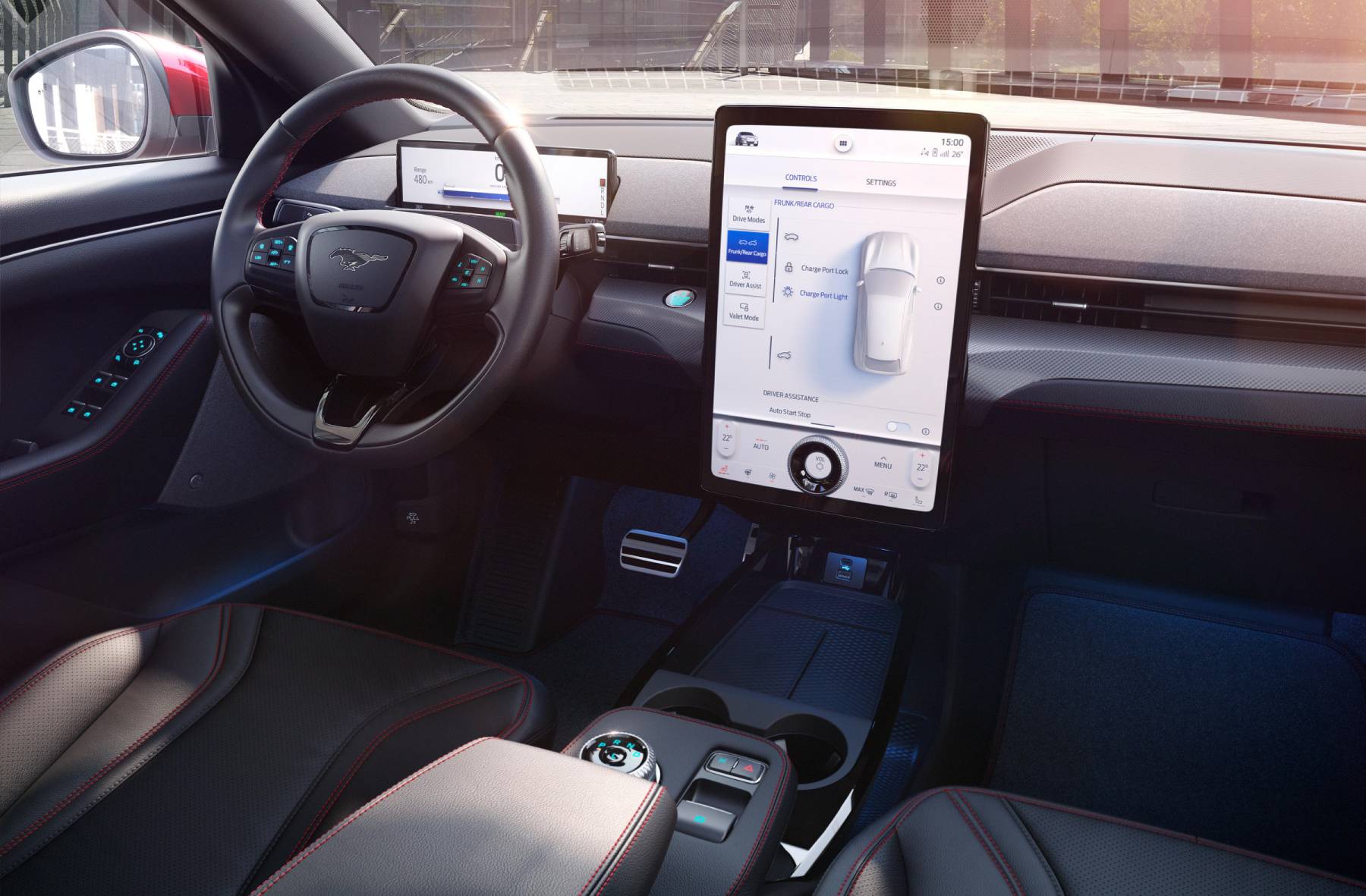 Το αποτέλεσμα με την αμιγώς ηλεκτρική Mustang Mach-E είναι μία «θέα» από το κάθισμα του οδηγού που αποτελεί σημείο αναφοράς στο δρόμο προς τον εξηλεκτρισμό. Η αφαιρετική σχεδίαση στόχο έχει να προσφέρει στους οδηγούς ένα άνετο και απλό περιβάλλον. Στην περίπτωση της Mustang Mach-E, αυτό περιλαμβάνει μία μεγάλη οθόνη αφής τοποθετημένη στο κέντρο, που συγκεντρώνει όσο το δυνατόν περισσότερα χειριστήρια σε ένα σημείο.
