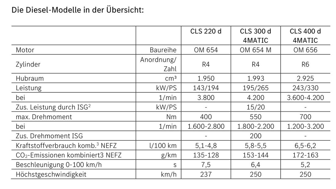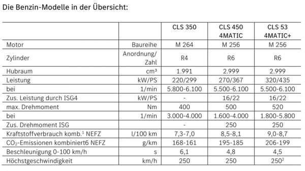 Στην γκάμα των κινητήρων δεν υπάρχουν αλλαγές (οι σημαντικότερες έγιναν πριν από ένα χρόνο) με εξαίρεση την CLS 300 d με τον δίλιτρο diesel να αποκτά ήπια υβριδική υποβοήθηση και να αποδίδει 264 ίππους. Με mild hybrid τεχνολογία αναβαθμίστηκε και η δίλιτρη βενζίνης CLS 350 με 299 άλογα.