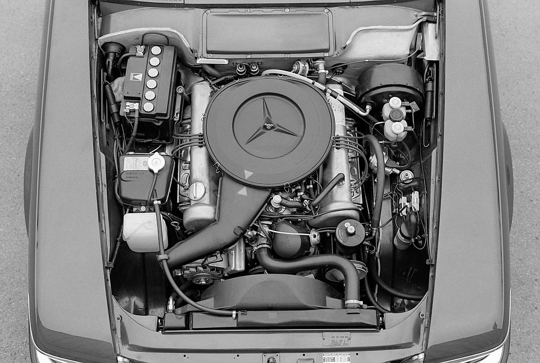 Σχετικά με τον V8 των 200 ίππων είχε χωρητικότητα 3,5 λίτρα, αλλά στην 450 SL των 4,5 λίτρων απέδιδε 225 ίππους. Αυτή η έκδοση κυκλοφορούσε μόνο στις ΗΠΑ και αργότερα προστέθηκε η εξακύλινδρη σε σειρά έκδοση 280 SL με 185 ίππους. Υπήρξαν διάφορες V8 εκδόσεις και προς την δύση της η R107 απέκτησε τον μεγαλύτερο V8 των 5,5 λίτρων.