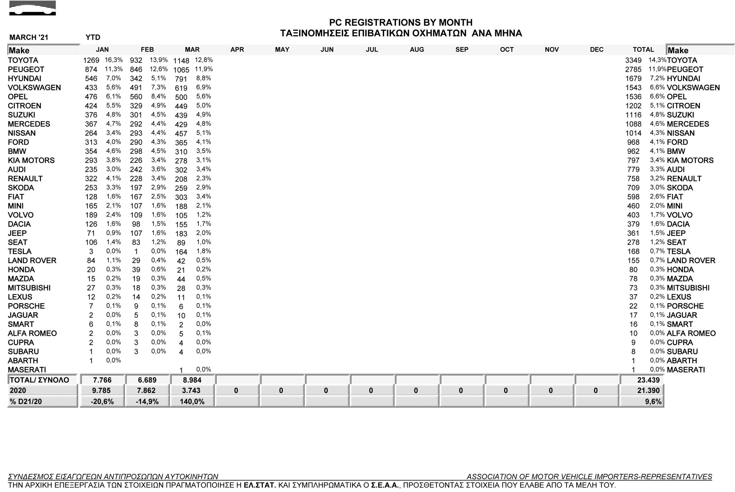 Σε κάθε περίπτωση σας παραθέτουμε τον επίσημο πίνακα των πωλήσεων αυτοκινήτων για το διάστημα Ιανουαρίου – Μαρτίου προκειμένου κι εσείς να εξάγετε τα δικά σας συμπεράσματα.