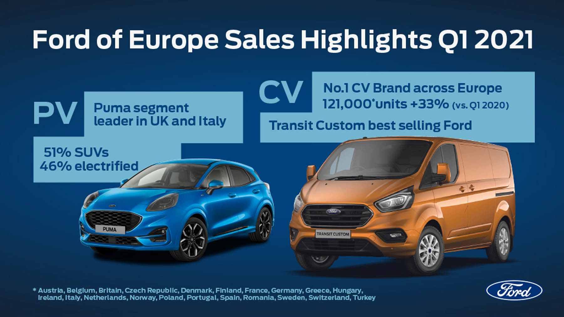 Η Ford αύξησε τις πωλήσεις της στην Ευρώπη τους πρώτους τρεις μήνες του 2021 κατά 7,7% σε σχέση με την αντίστοιχη περσινή περίοδο. Στα επιβατικά οχήματα, το δημοφιλέστερο σε πωλήσεις μοντέλο της Ford στη γηραιά ήπειρο το πρώτο τρίμηνο του 2021 ήταν το Puma.