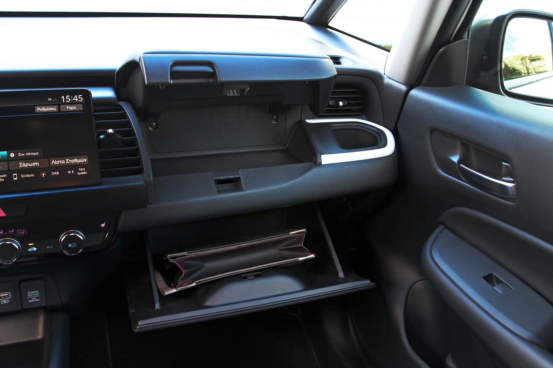 Όσο για τους χώρους για μικροαντικείμενα, δεν μπορούμε παρά να βγάλουμε το καπέλο στους Ιάπωνες που δεν έχουν αφήσει ούτε εκατοστό ανεκμετάλλευτο. Ποτηροθήκη αριστερά από το τιμόνι, άλλες δύο στην κεντρική κονσόλα, μεγάλος χώρος μπροστά από το λεβιέ ταχυτήτων και το κλασσικό ντουλαπάκι του συνοδηγού. Όλα αυτά είναι υπεραρκετά για πρακτική, άνετη και ασφαλή (10 αερόσακους) συμβίωση, κάτι που θα θέλαμε να βλέπαμε και σε μοντέλα μεγαλύτερης κατηγορίας.