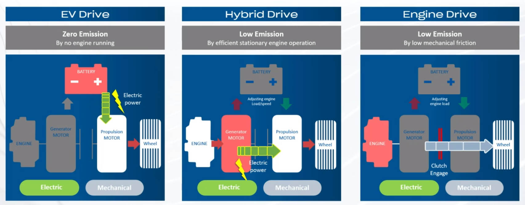 Δεν υπάρχει κιβώτιο με γρανάζια, μήτε μετατροπέας ροπής, αλλά ένα κιβώτιο μονής σχέσης με ένα locκ-up συμπλεκτάκι που συνεργάζεται με το ένα ηλεκτρικό μοτέρ 80 kW (το άλλο 70 kW λειτουργεί περισσότερο σαν γεννήτρια για την φόρτιση της μικρής μπαταρίας >1 kWh). Στόχος του όλου συστήματος είναι η μικρότερη συμμετοχή του βενζινοκινητήρα και το βάρος της κίνησης να πέφτει στο βασικό μοτέρ.