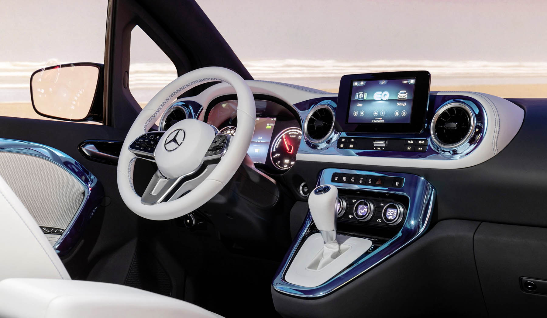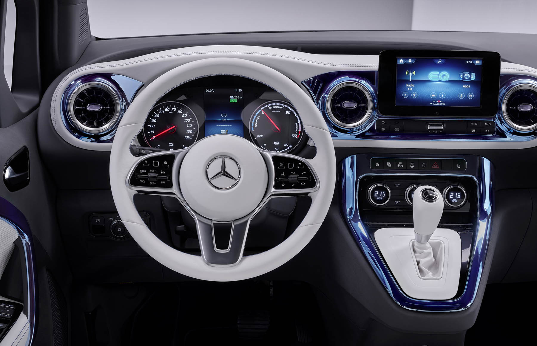 Η T-Class (αλλά και το EQT που μοιράζεται τα ίδια μηχανικά μέρη με το Kangoo E-Tech Electric) έχει εξελιχθεί σε συνεργασία με την Renault και βασίζεται στην πλατφόρμα CMF-B. Ωστόσο, αυτή τη φορά οι Γερμανοί θέλησαν να κάνουν πιο αναγνωρίσιμο το μοντέλο τους με μια πιο space σχεδίαση με αποκορύφωμα την εντυπωσιακή μάσκα και τα LED φωτιστικά σώματα.