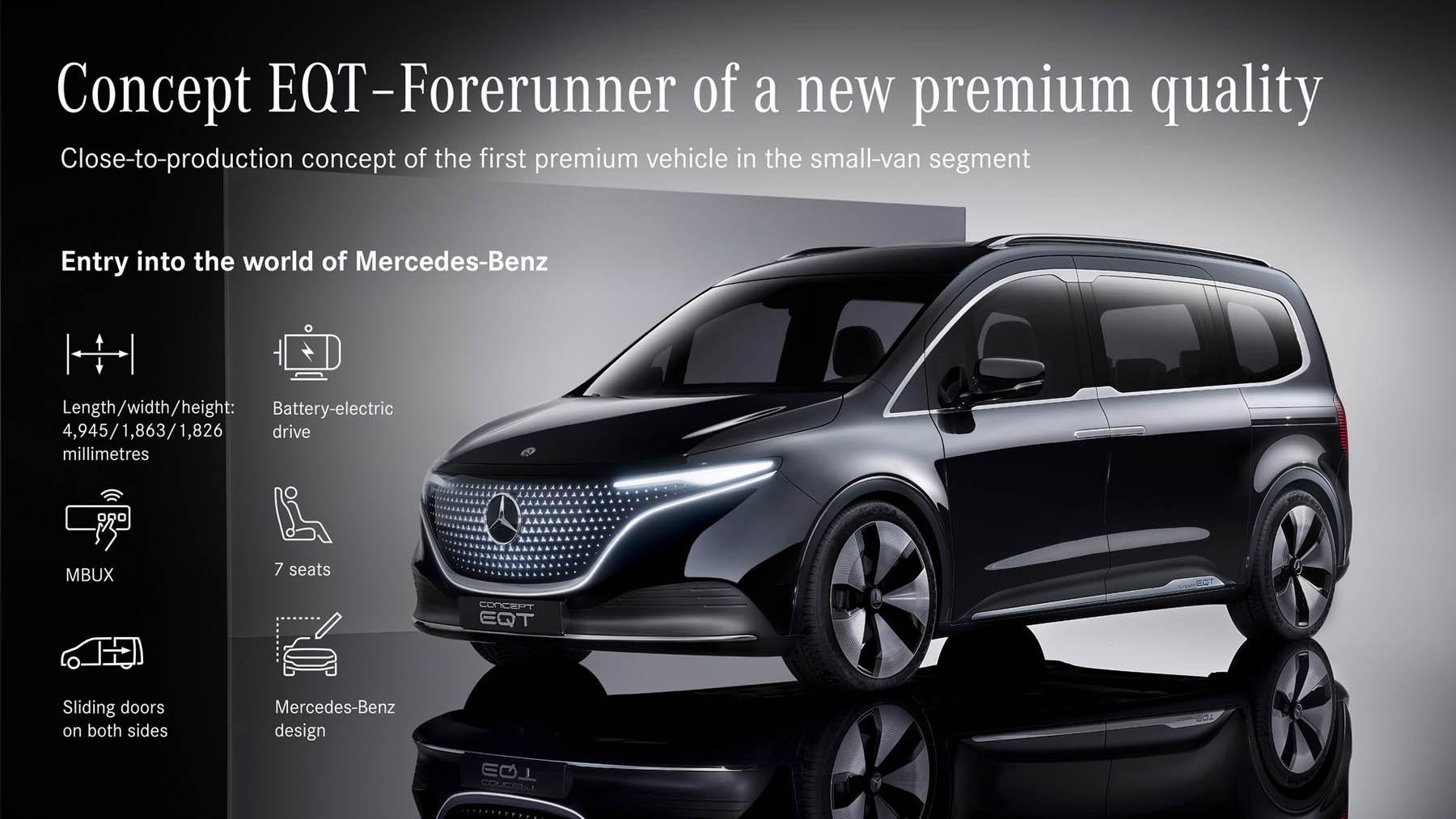 Η Mercedes επέλεξε να παρουσιάσει πρώτα την ηλεκτρική EQT που θα αποτελέσει το ένατο μοντέλο στην γκάμα των ηλεκτρικών EQ. Πρακτικά το πολύ εντυπωσιακό MPV αποτελεί τη νέα γενιά του Citan και θα το δούμε τόσο σε επιβατικές εκδόσεις όσο και σε επαγγελματικές.